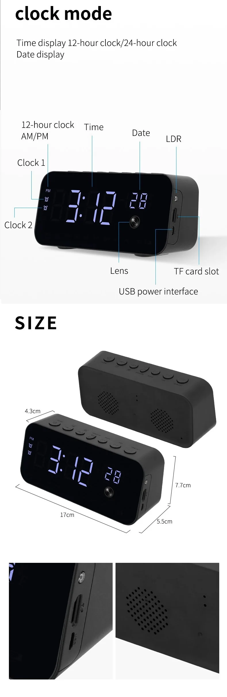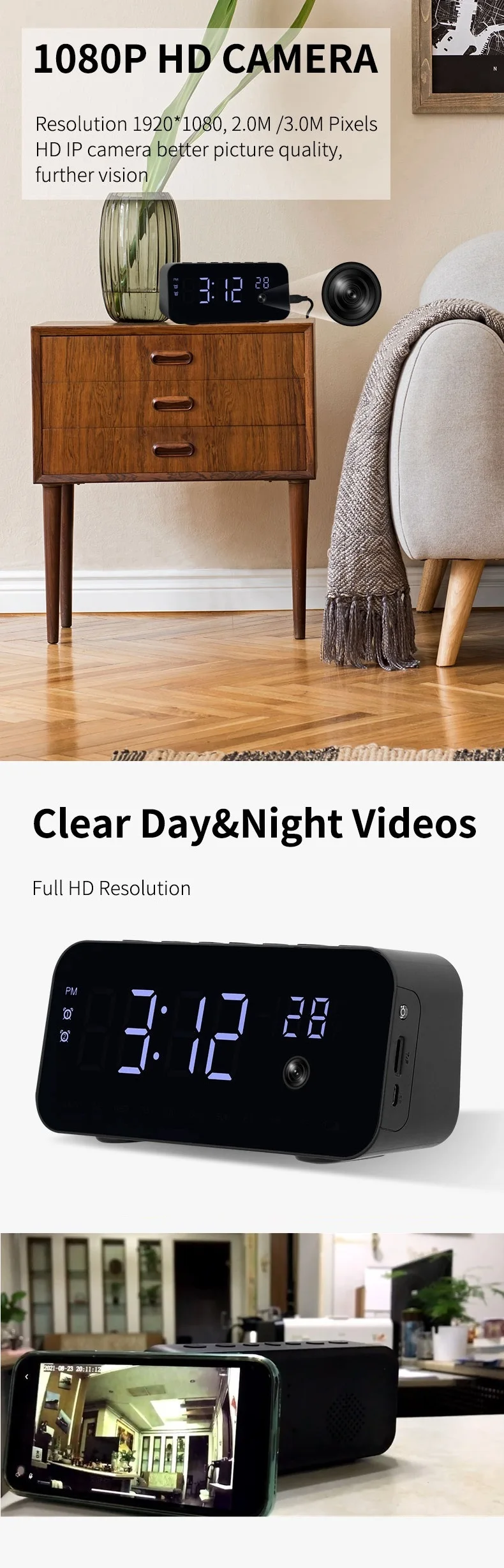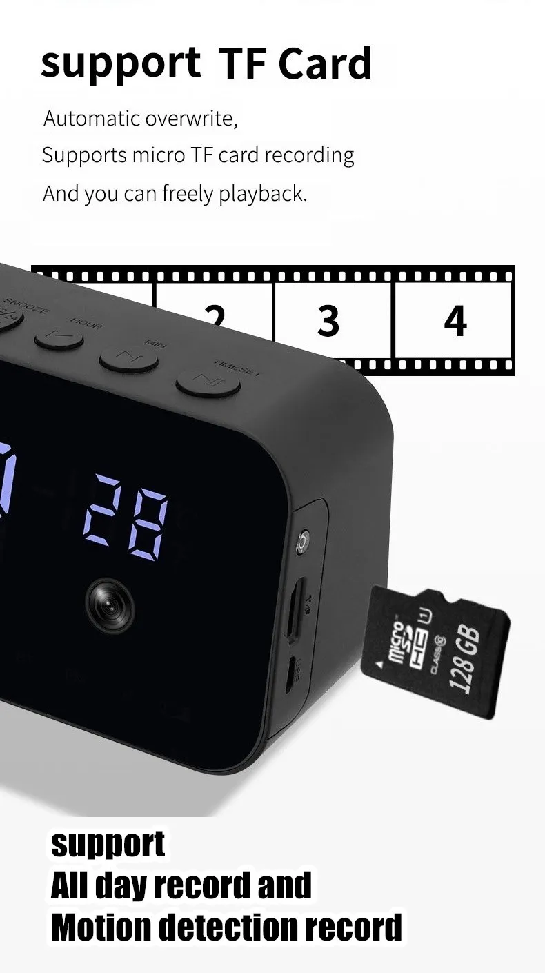 Цифровой смарт-будильник с камерой 1080P, беспроводная скрытая TF-к...
