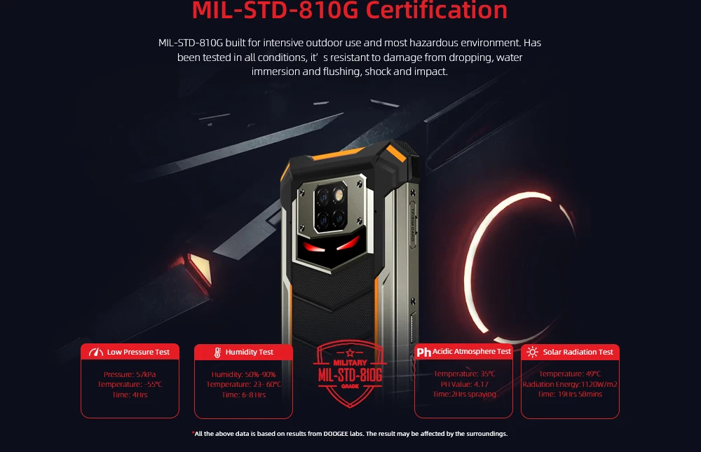 MIL-STD-810G СертификацияMIL-STD-810G создан для интенсивного использования на открытом воздухе и наиболее опасных условий. Был протестирован во всех условиях, он устойчив к повреждениям от падения, погружения в воду и смывания, ударов и ударов.