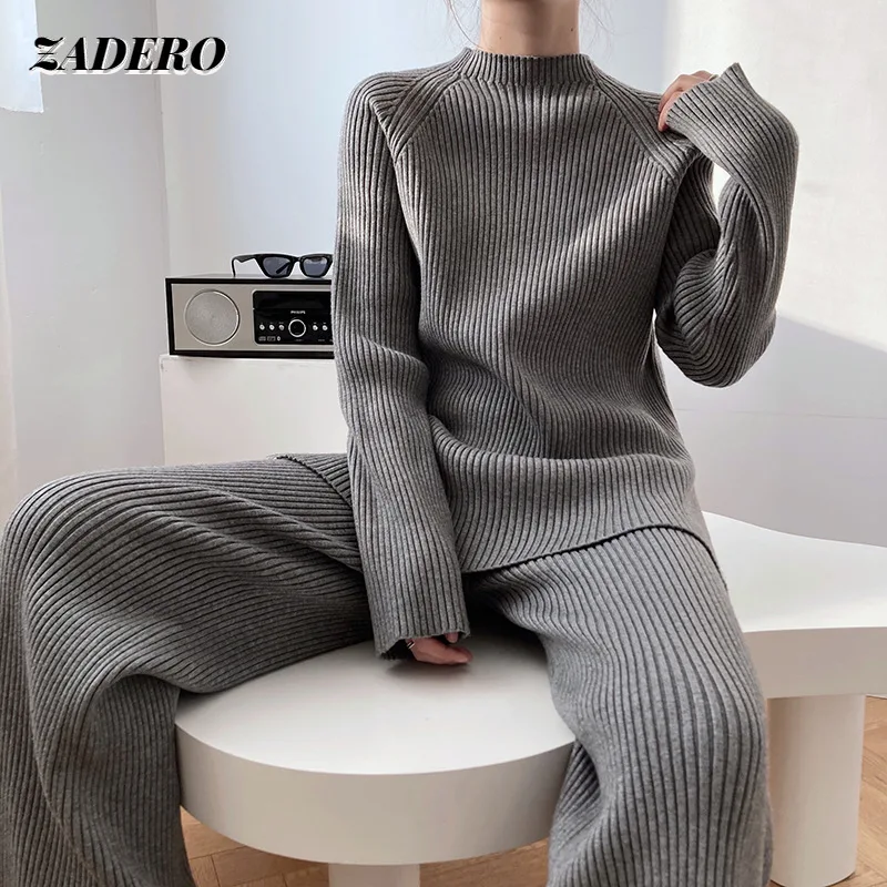 Женский трикотажный комплект из 2 предметов, повседневный свободный свитер с высоким воротником и Боковым Разрезом, спортивный костюм с эластичным поясом, осень 2021