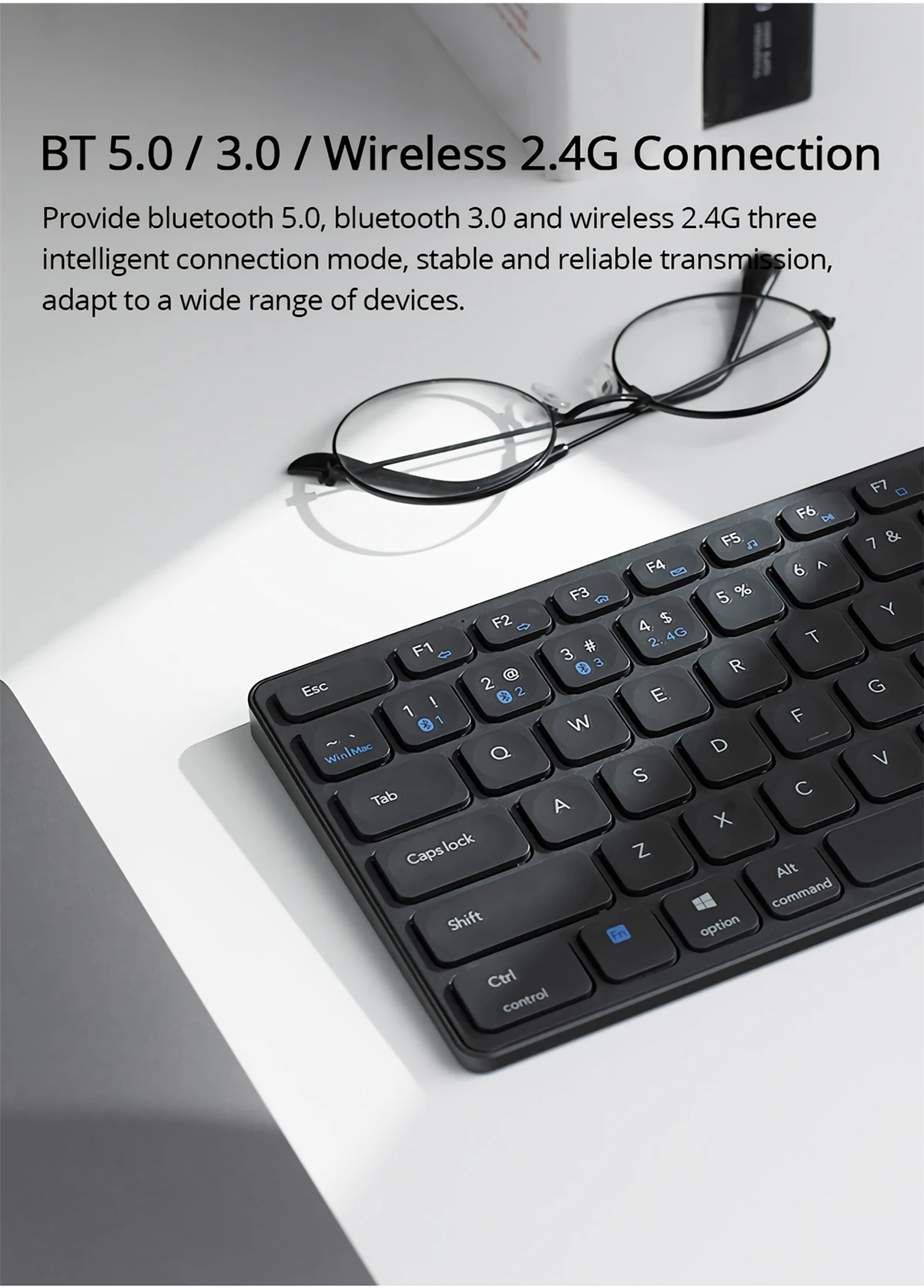 ● 3 режима беспроводного подключения: BT5.0/BT3.0/беспроводной 2,4G● 4 устройства можно свободно переключать, и до одного устройства 2,4G и трех устройств bluetooth можно переключать циклически.● Рама и задняя панель из матового алюминиевого сплава● Ножничная конструкция, шоколадные ключи● 13 мультимедийных клавиш в системе Win● Совместимость с Mac OS и функцией кнопки двойной системы Win● Встроенный литиевый аккумулятор емкостью 300 мАч, срок службы батареи около 60-96 часов