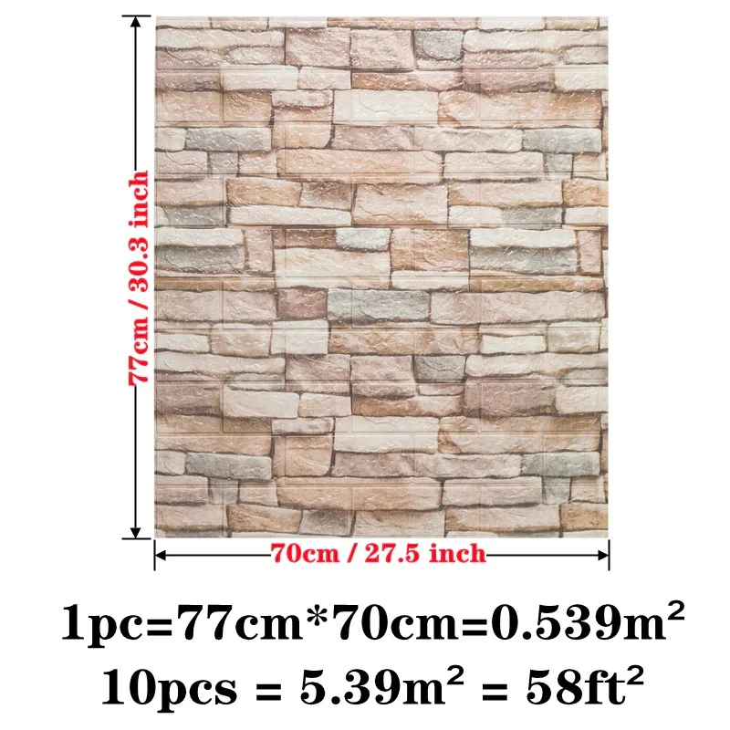 10 шт. водонепроницаемый самоклеящийся стикер на стену с рисунком кирпича/камняИндивидуальный размер: 77 × 70 см/27,5 × дюймаПокрытие упаковки: 5,39 м²/58 футов ²Толщина плитки: 4 мм/0,15 дюймаВес упаковки: 1300 гМатериал: ПВХПроисхождение: CNЦвет: 9 вариантов (как показано на картинке)