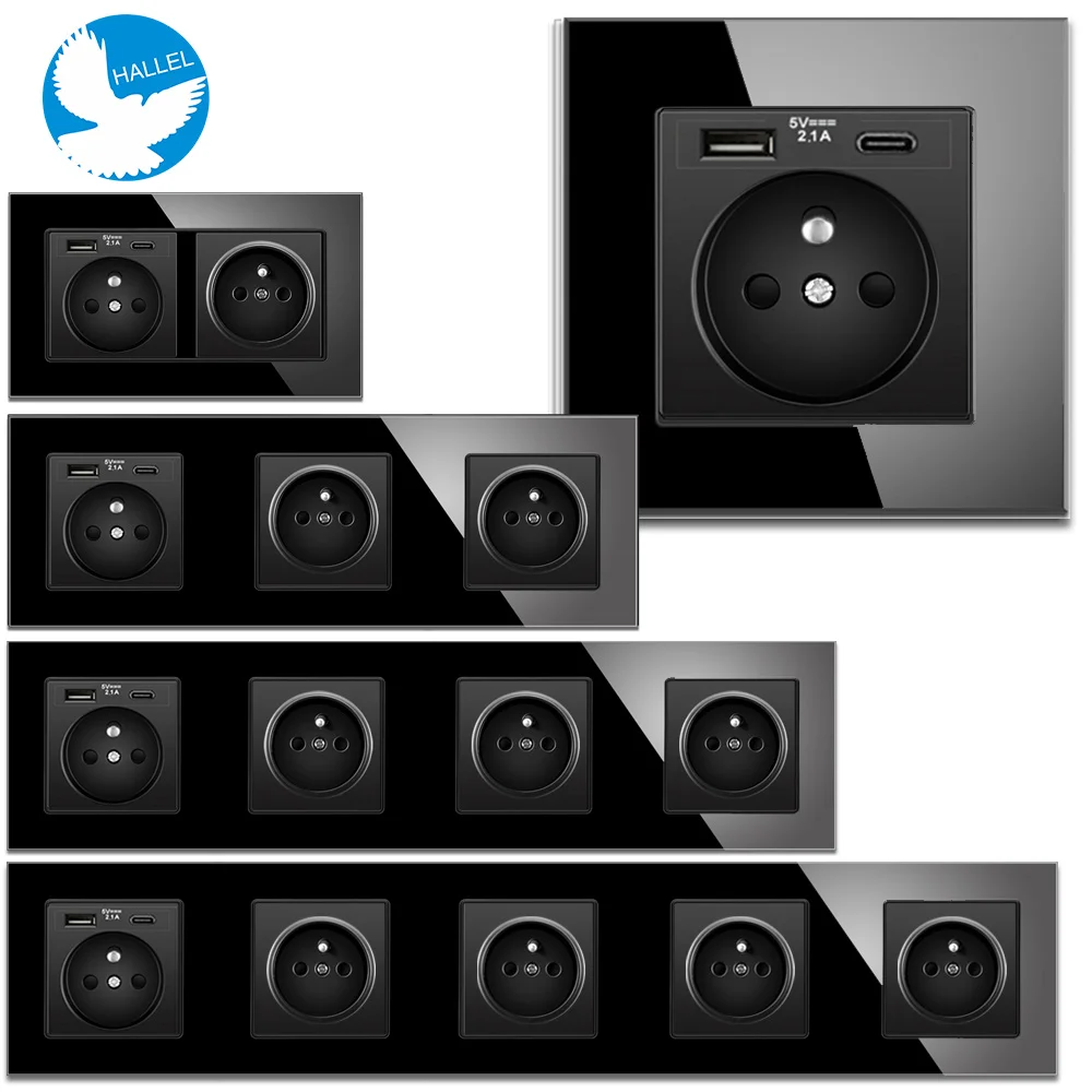 Многорамный французский USB разъем питания типа C 2100mA быстрая зарядка, Хрустальная черная панель Français EU розетка 110-250V 16A заземленная