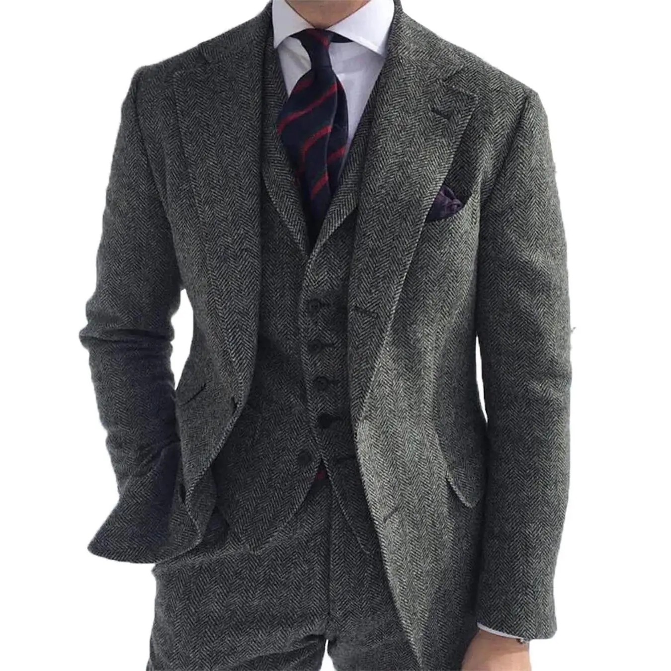 Мужские костюмы из 3 предметов, зеленый шерстяной твидовый деловой ретро-костюм в елочку, классический узор, смокинги для свадьбы, блейзер для жениха, брюки, жилет 2021