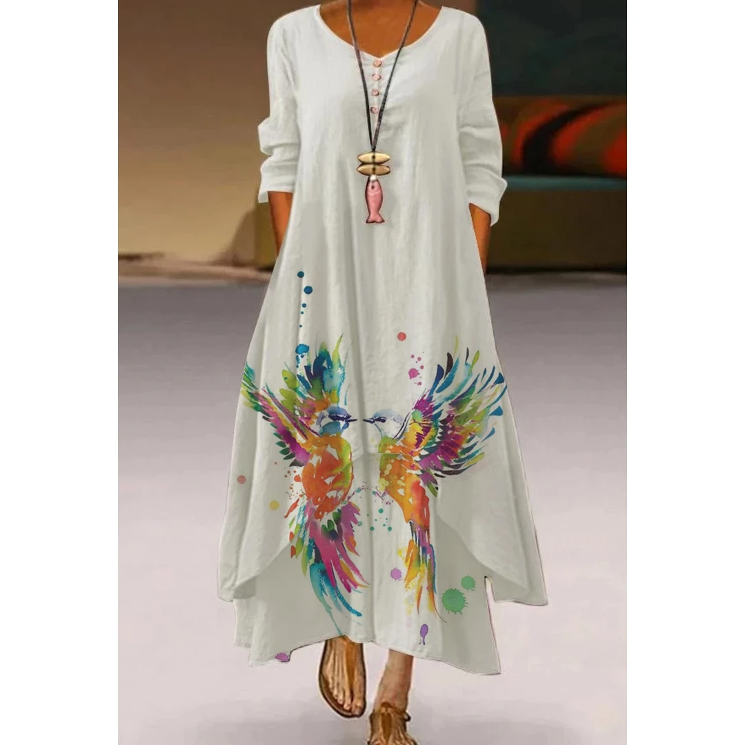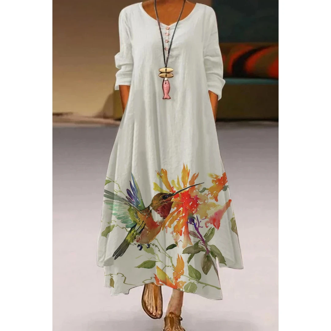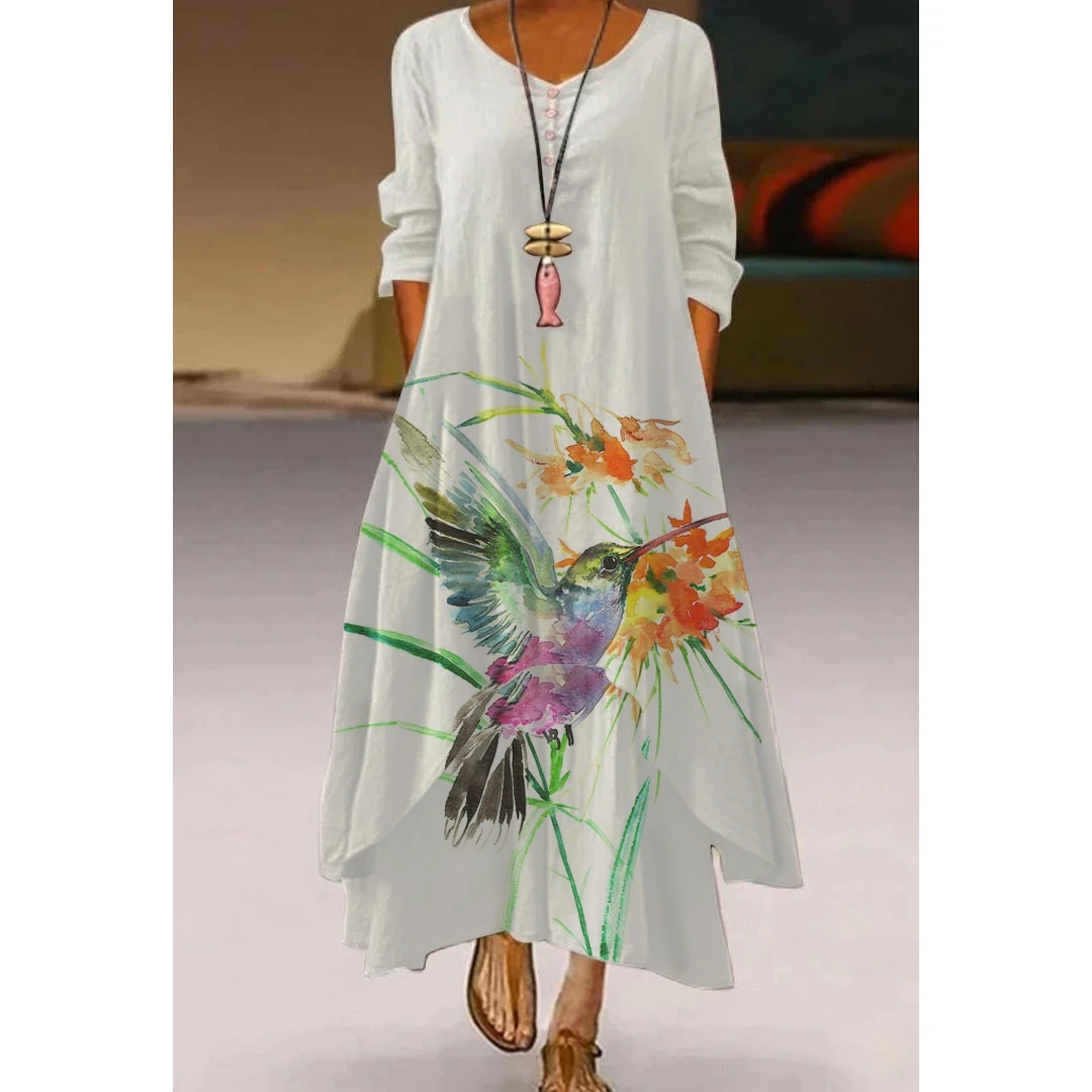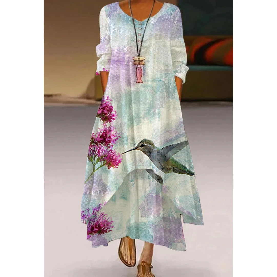 Женское длинное платье с цветочным принтом, повседневное элегантное платье макси с длинным рукавом и принтом птиц
