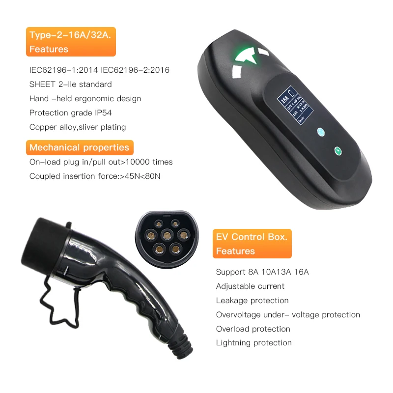 -Высокая совместимостьУстановка всех EVs с входом типа 2, 100% правильно и эффективно. -Быстрая и простая эксплуатацияПросто Подключите вилку к входу EV, а затем зарядное устройство автоматически обнаружит состояние подключения и протокол рукопожатия и начнет зарядку. -Светодиодный дисплейПоказывает состояние зарядки через экран. -Гарантия безопасностиУже прошли все тесты TUV. Есть все виды защитных мер для обеспечения безопасности каждого пользователя. -Интеллектуальный чипАвтоматическое устранение мелких проблем с зарядкой во время зарядки. Огни мигают разными способами, указывая на различные проблемы, которые помогут вам узнать ситуацию с зарядкой прямо сейчас. -Прочный корпусС совершенно новым дизайном и прочным высокопрочным АБС-пластиком, будет представлено непревзойденное качество, даже для того, чтобы нести вес автомобиля, который уже был протестирован. -IP54Уникальный водонепроницаемый дизайн гарантирует, что вы можете использовать его в любое время с уверенностью.