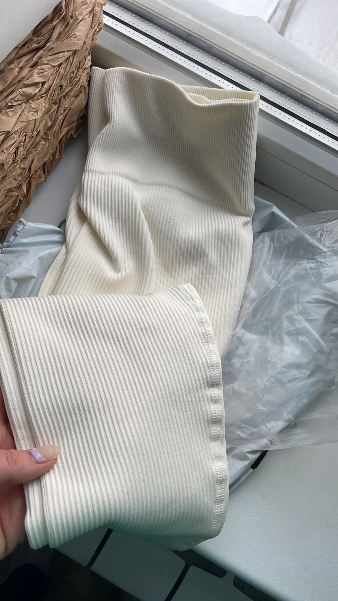 товар шёл 1.5 месяца, я уже отвыкла от таких долгих ожиданий посылки. легинсы очень приятные к телу, слега просвечивают, приятного молочного цвета, на ОТ 67 и ОБ 96 можно было взять и на размер меньше, так как этот свободноват. клёвые леги для стильных образов на зиму со светлыми ботинками и сапогами, а также светлыми платьями-свитерами