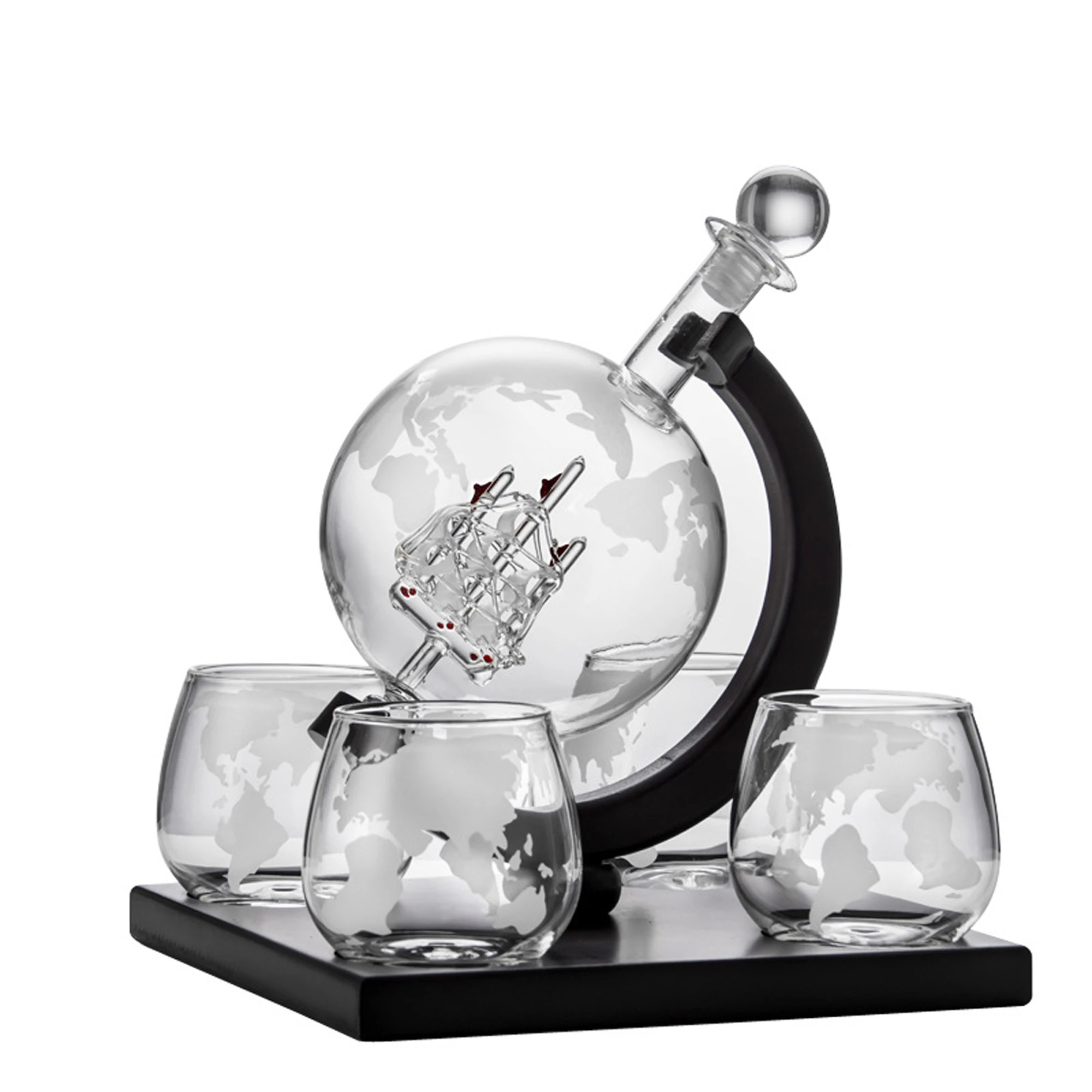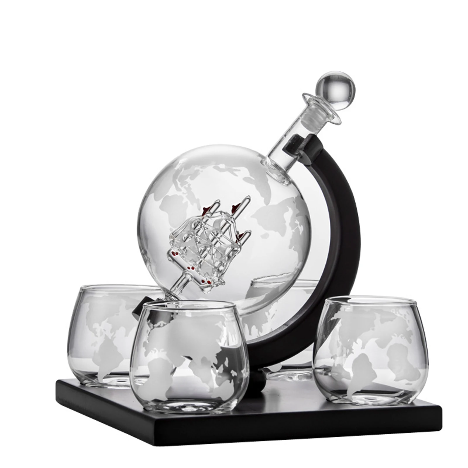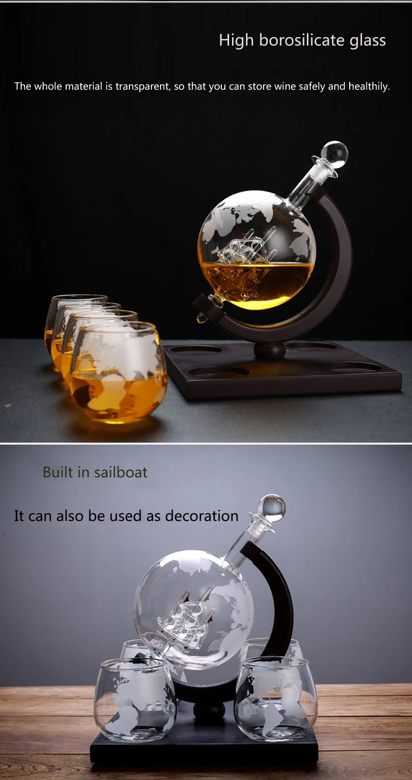 6 в 1 комплект: наш земной шар виски графин поставляется со старинным корабль графин, 4 карта мира травления стекла и 1 деревянная подставка.