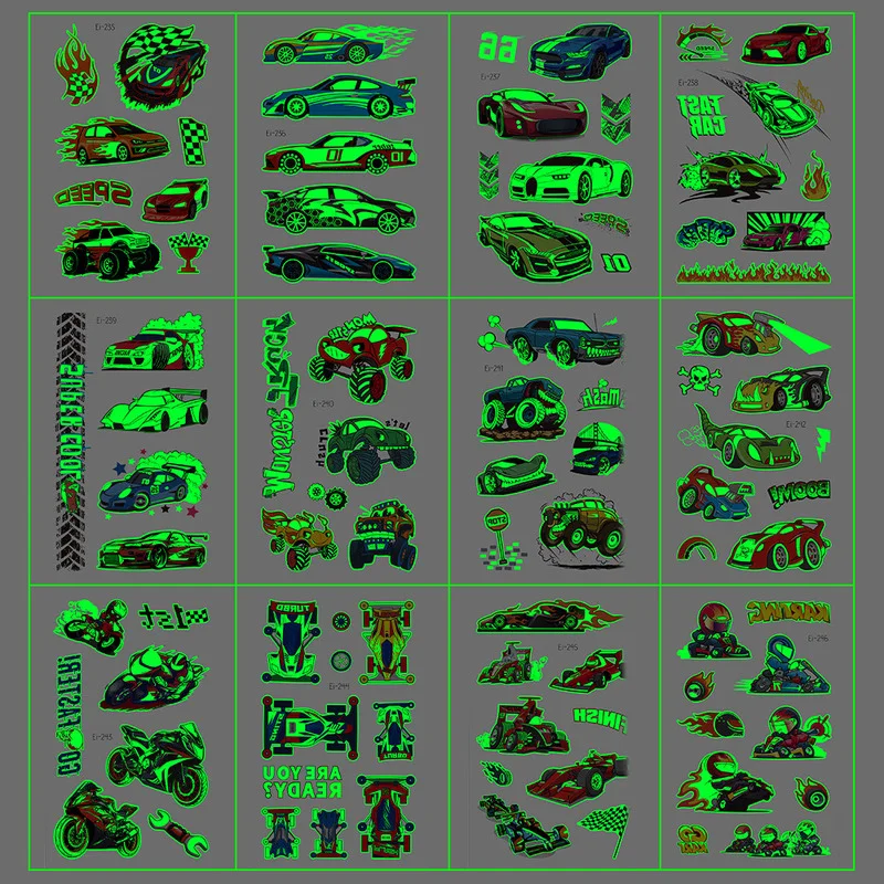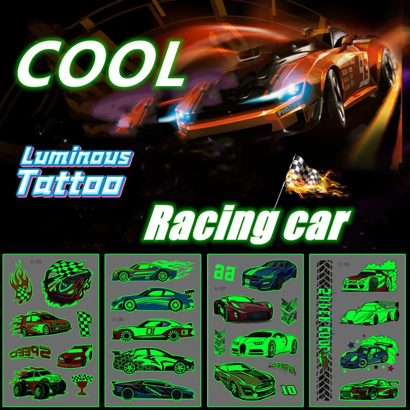 Робот-Татуировка для детей, светящийся Темный водонепроницаемый светящийся гоночный автомобиль, динозавр, имитация татуировки, наклейки, боди-арт, Рождество, Хэллоуин