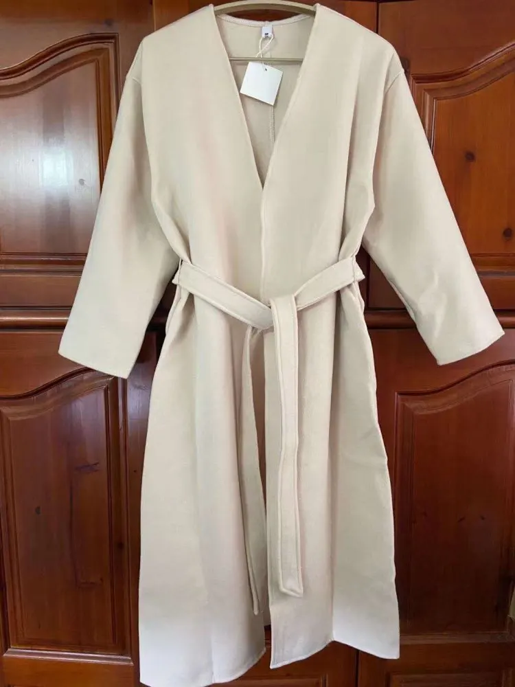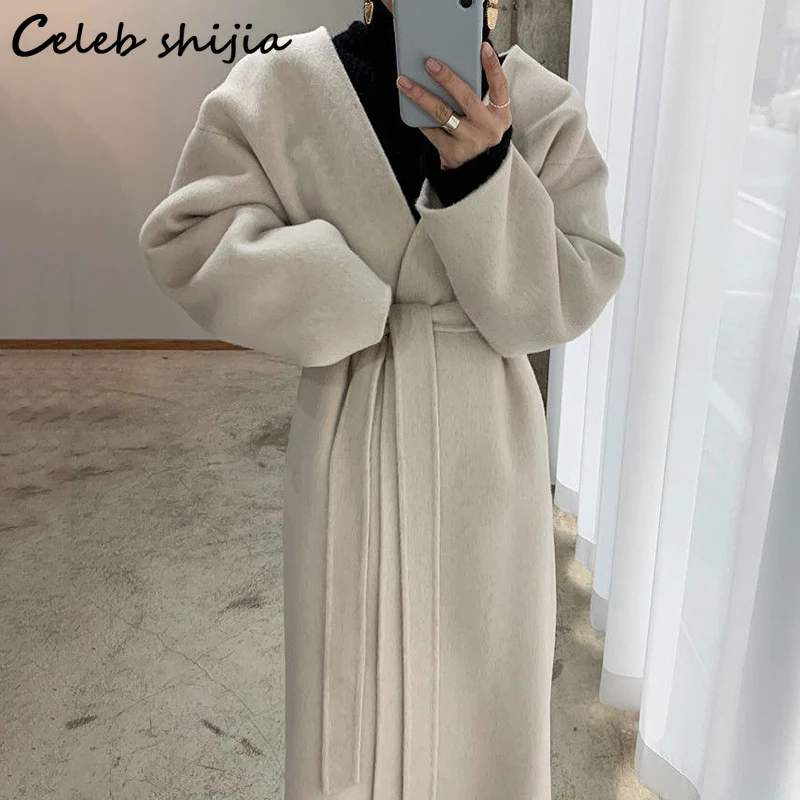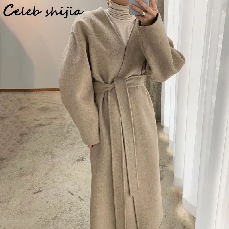 Женское шерстяное пальто со шнуровкой, длинное плотное пальто цвета хаки с V-образным вырезом, Элегантная куртка из смешанной шерсти, Корейская Свободная куртка на осень и зиму 2021