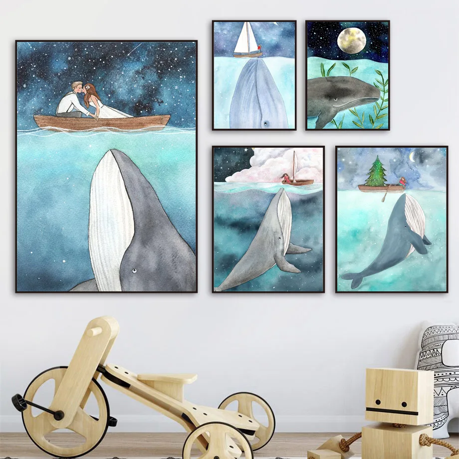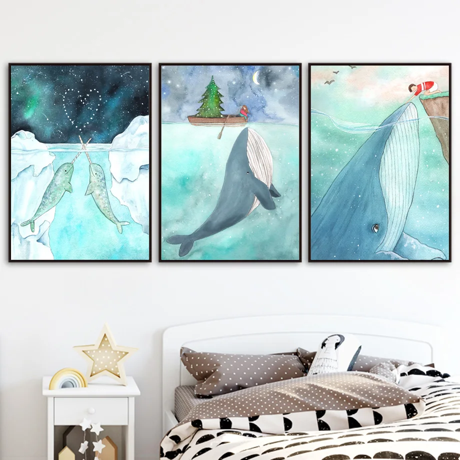 Кит Нарвал девочка мальчик океан Мир Детская настенная живопись на холсте скандинавские плакаты принты настенные картины для детской комнатыМатериал: экологически чистый хлопокХарактеристика: солнцезащитный, водонепроницаемый, никогда не выцветает