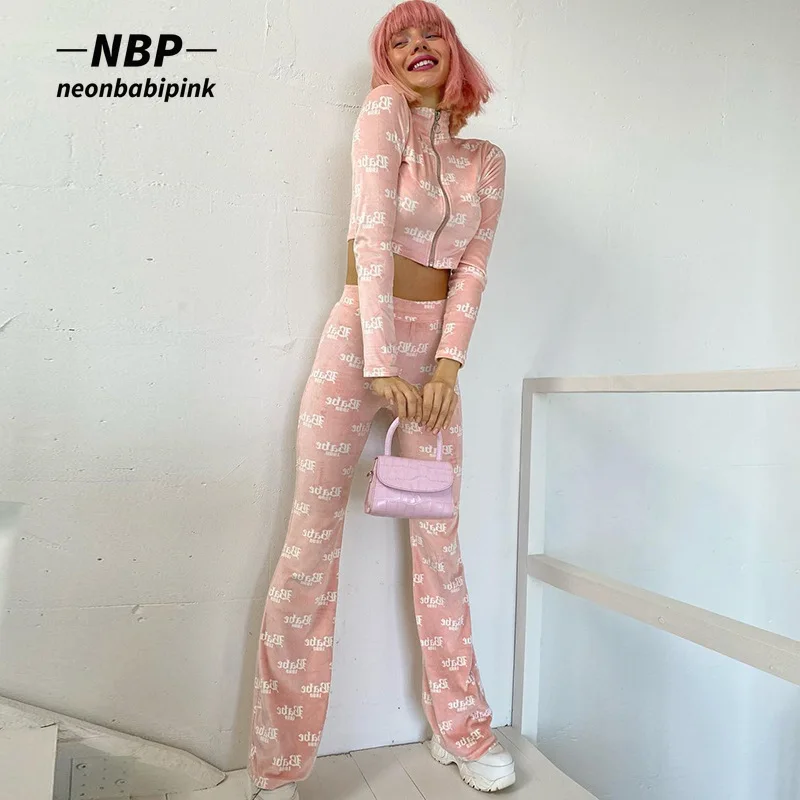 Женский бархатный комплект одежды NEONBABIPINK, розовый комплект из 2 предметов, куртка на молнии с длинным рукавом и спортивные штаны, спортивный костюм Y2k, подходящие комплекты