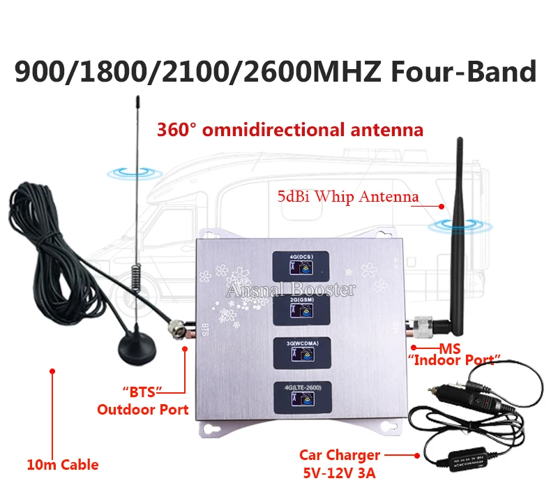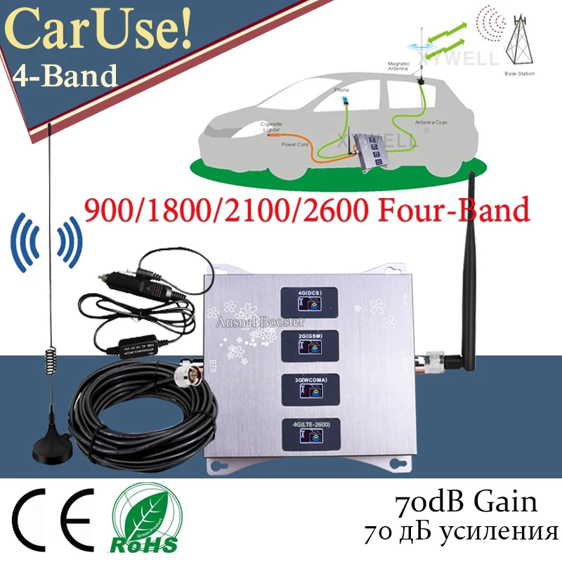 Использование в машине! 900 1800 2100 2600 МГц четырехдиапазонный усилитель мобильного сигнала GSM репитер 2g 3g 4g усилитель данных сотовой связи GSM DCS WCDMA LTE