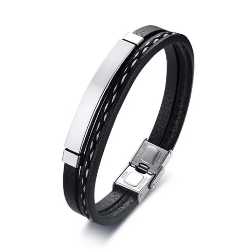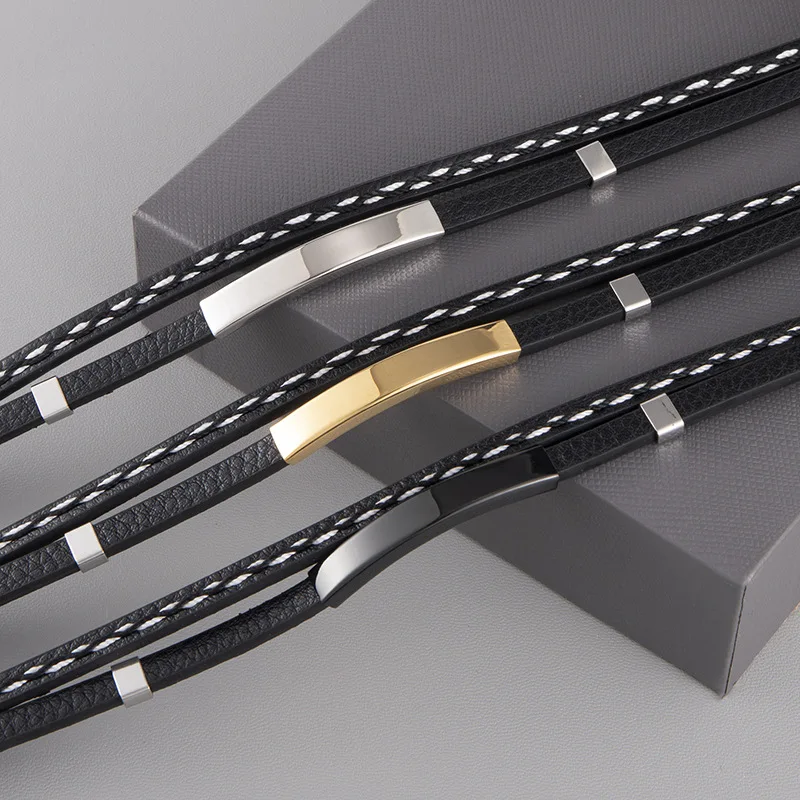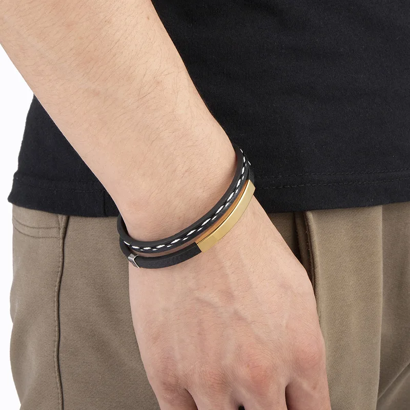 Браслет мужской кожаный, многослойный, черный, из нержавеющей стали