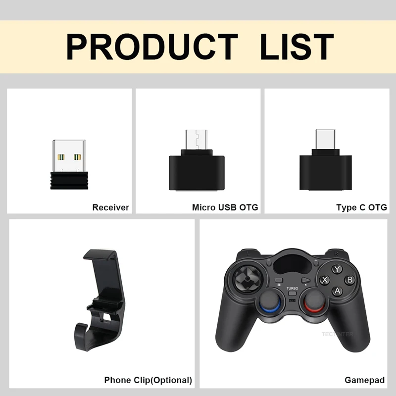 Приемник x1Micro USB OTG x1Тип C OTG x1Зажим для телефона x1 (опционально: один вариант включает и другой не включает. Посмотрите на варианты перед покупкой)Геймпад x1