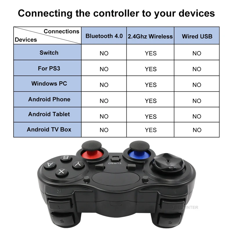 Этот игровой контроллер не имеет функции Bluetooth, без вибрации, с использованием зрелой технологии беспроводной передачи 2,4G! Поддержка всех видов устройств android. Поддержка ПК, планшета, TV box, smart TV, для PS3. С дизайном кривой человеческого тела, вы не будете чувствовать усталость, даже если вы зависимы от игры в течение длительного времени!