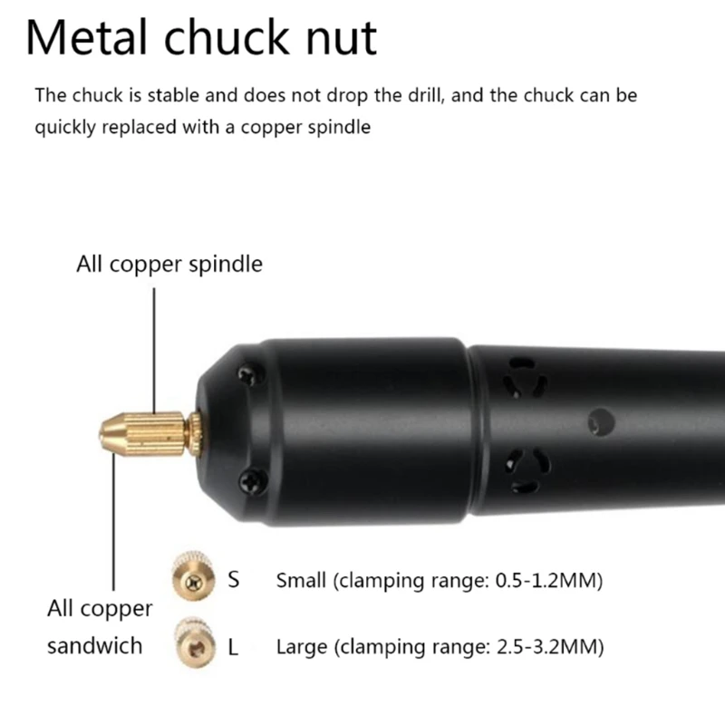 Mini Drill Mini Electric Hand Drill Electric Grinder Drilling DIY Mini Micro Small Metal Electric Motor Hand DrillOOTDTY Features: 100% brand new and high qualitySet: 1 electric drill + 1 wrench + 10 drill bits (0.8-1.2mm boxed) + 50 gold claw nails + 50 silver claw nails + 20 gold key ring + 20 silver key ring + 1 small clamping bed.The mini electric drill tool is specially designed for resin jewelry making. Needle pliers can easily help to drill small holes in the resin. It is an excellent epoxy resin kit for necklaces, earrings, bracelets, pendants, keychains, models, sculptures, dolls, etc.Our electric drills are driven by power. Compared with manual drills, it saves time, labor, and accuracy.Electric drills are durable and reusable. They can be used on resin, wood, plastic, polymer clay, beads, pearls or other non-hard surfaces. They are not suitable for hard surfaces such as iron and stone.Easy to use: After selecting and installing the required drill bit, as long as the power is connected and the switch is turned on, you can drill holes for resin molds, crafts or other DIY projects that require precise holes. In addition, the package contains detailed instructions for installing the drill.Specification: Color:BlackMaterial: AlloySize: 12.3x3.5cm/4.84x1.37in(More detailed,please see photo.)Quantity: 1 SetPackage Includes: 1 Setx Mini Electric Drill Setnote: Please allow 0-1cm error due to manual measurement. pls make sure you do not mind before you bid. Due to the difference between different monitors, the picture may not reflect the actual color of the item. Thank you!