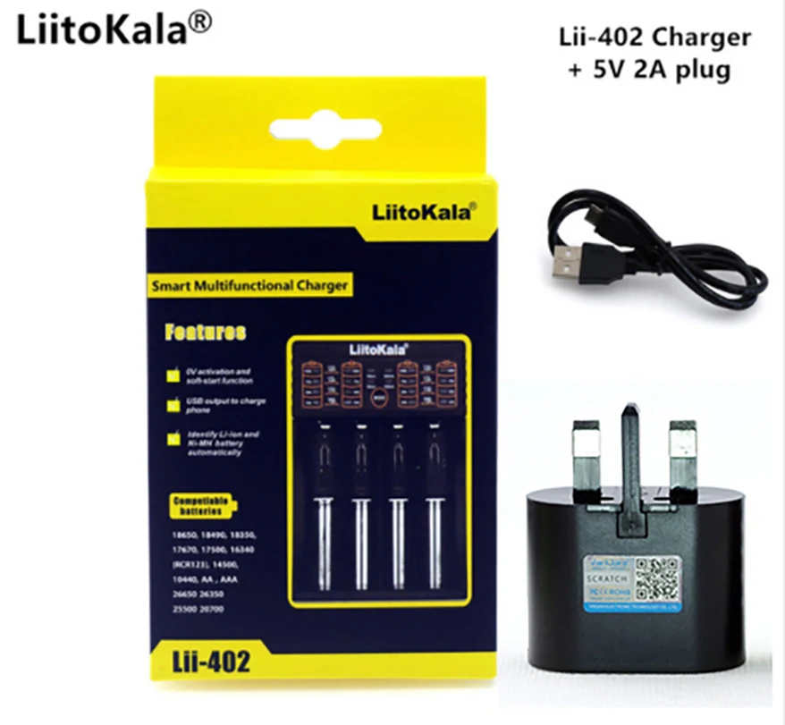 2, Liitokala Lii402 USB посылка: зарядное устройство Lii402 + USB кабель + руководство пользователя ( Примечание: эта посылка не включает вилку! )