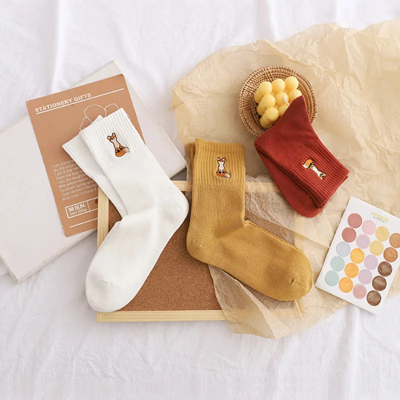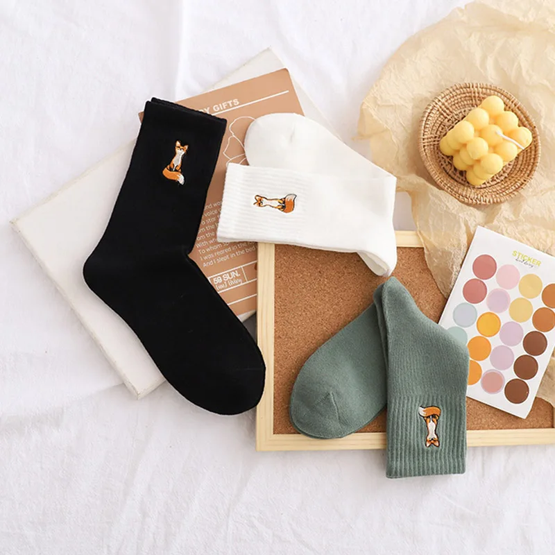 Милые дышащие хлопковые носки средней длины с вышивкой лисы; Однотонные женские носки; Сезон осень-зима; Носки с героями мультфильмов для девочек