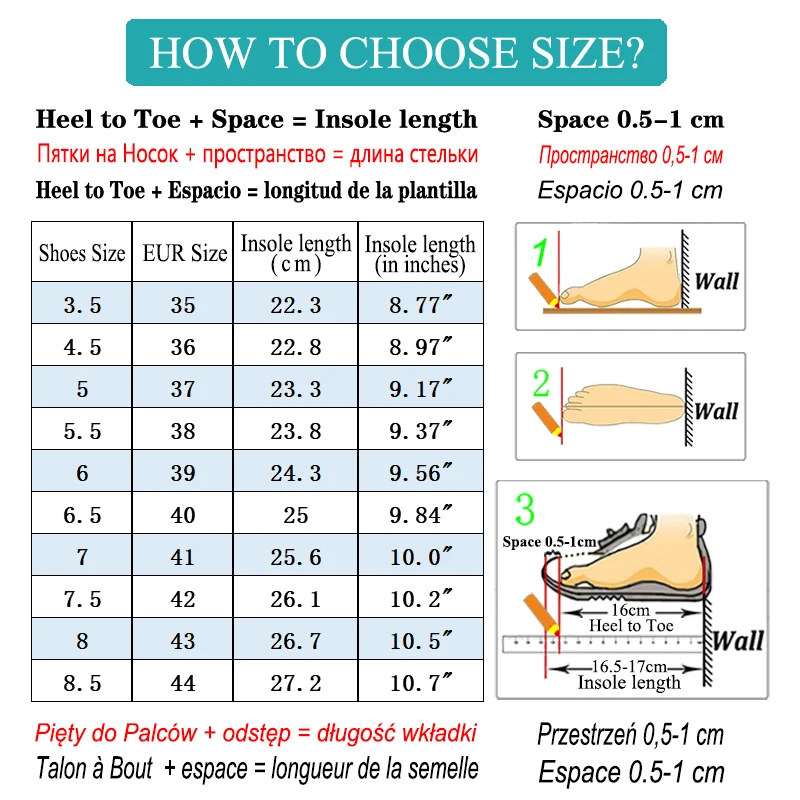 1. Стопы Длина + (0,5 ~ 1 см) = стелька Длина.2. Допускается погрешность в 1-3 мм из-за ручного измерения.3. Измерьте длину стопы и обратитесь к таблице размеров ниже, чтобы определить, какой размер вы должны приобрести.4. Если вы не знаете, как выбрать, пожалуйста, сообщите нам длину вашей стопы, мы выберем размер для вас.