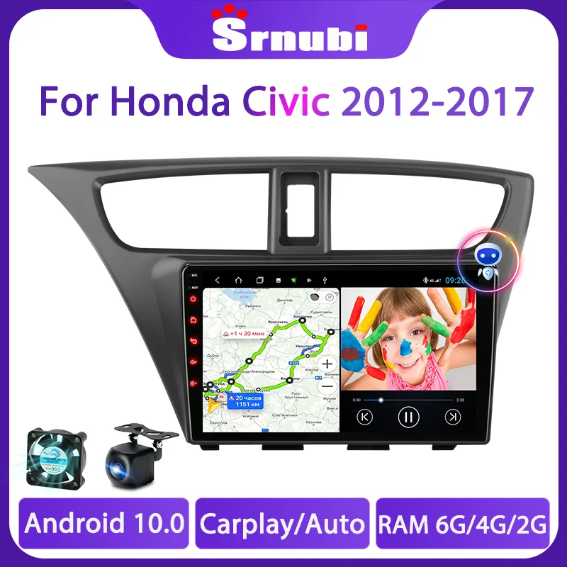 Автомагнитола Srnubi, Android 10, мультимедийный плеер 2DIN, GPS, 4G, Wi-Fi, стерео, DVD, для Honda CIVIC хэтчбек 2012 - 2017