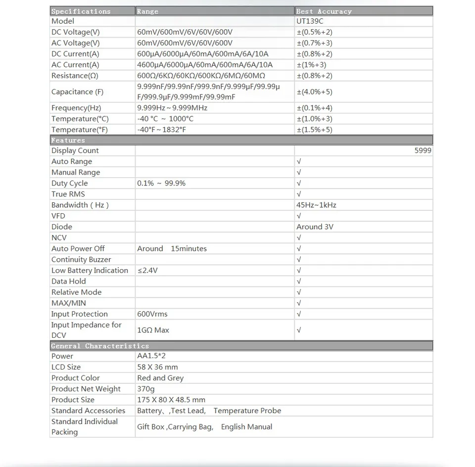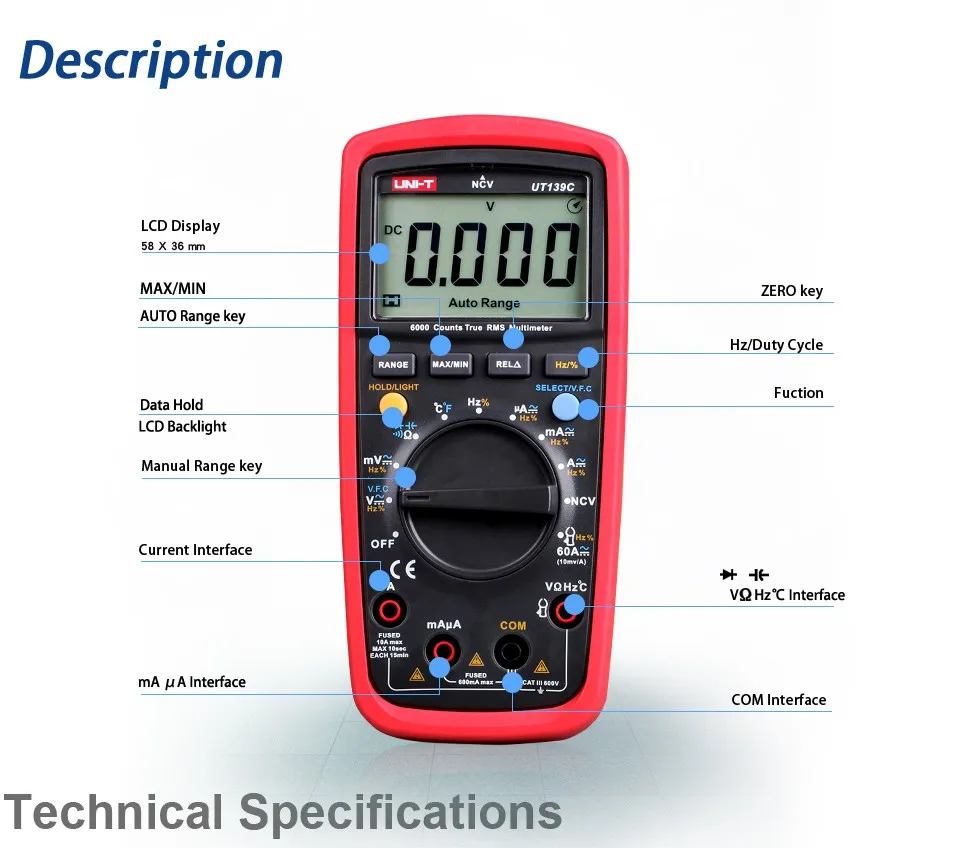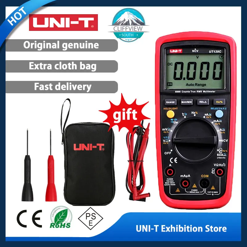 Цифровой мультиметр UNI-T UT139C с автоматическим выбором диапазона, измеритель истинных среднеквадратичных значений, ручной тестер конденсаторов, 6000 отсчетов, вольтметр, температурный