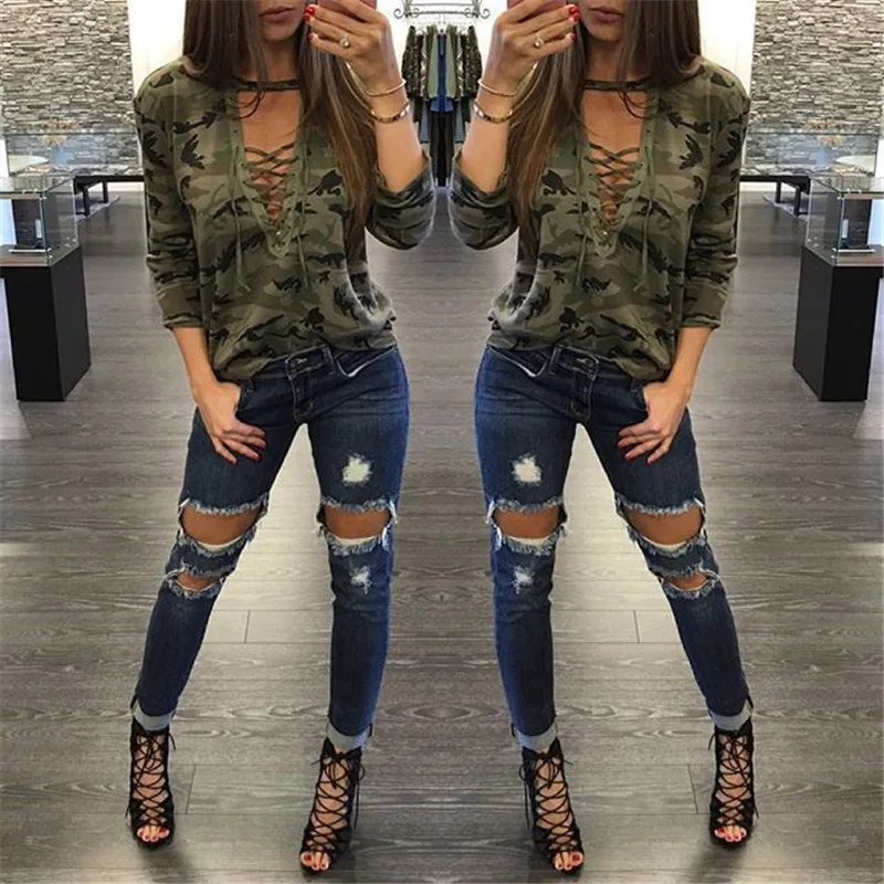 Женская камуфляжная футболка, Повседневная Свободная футболка с v-о...