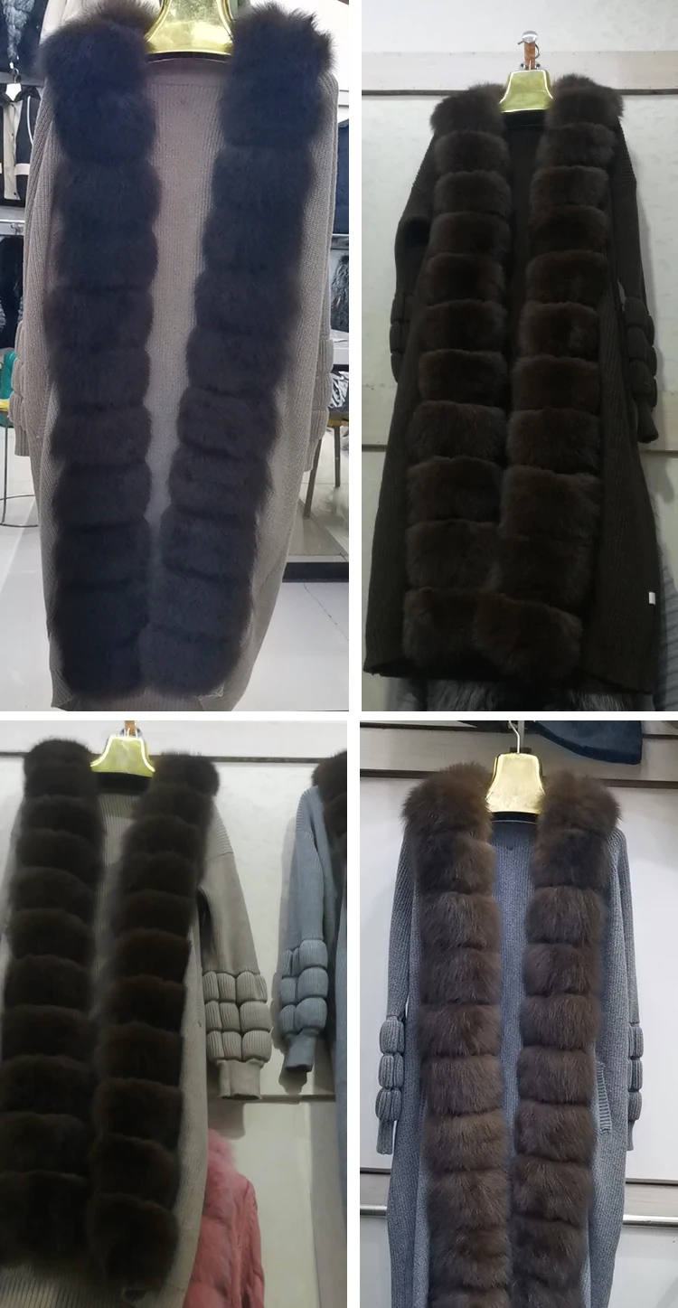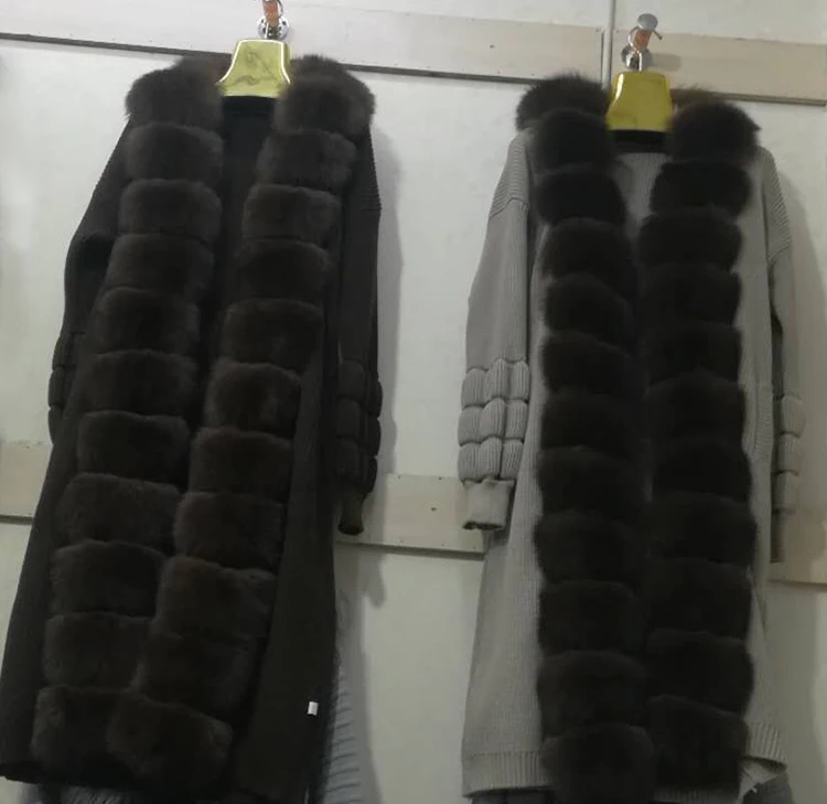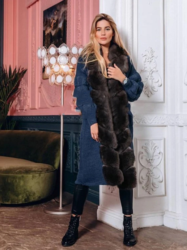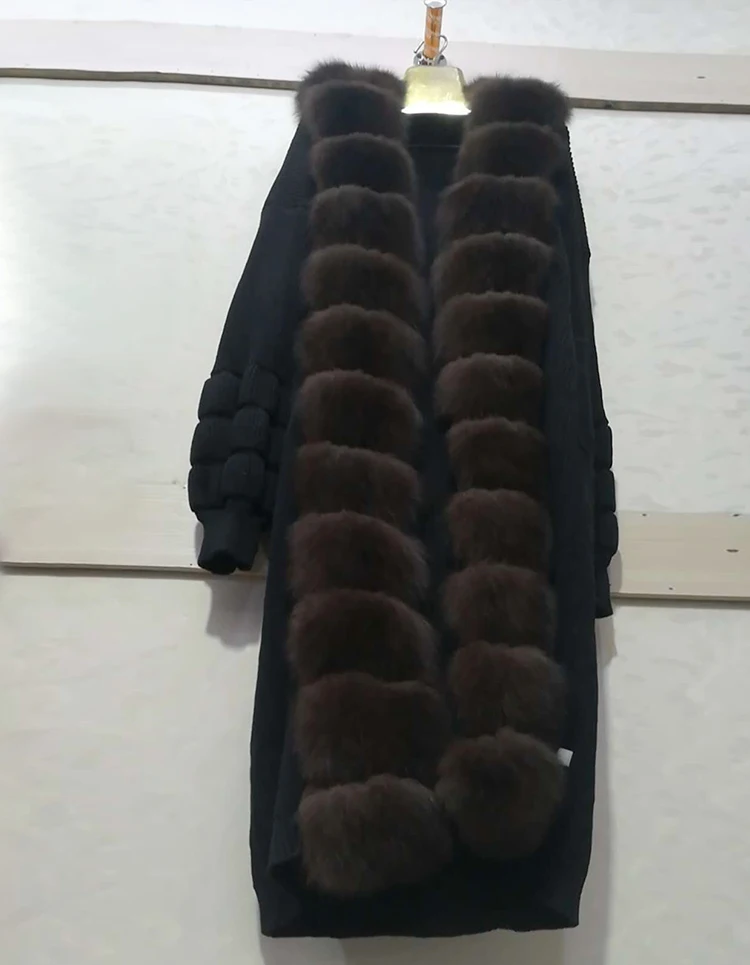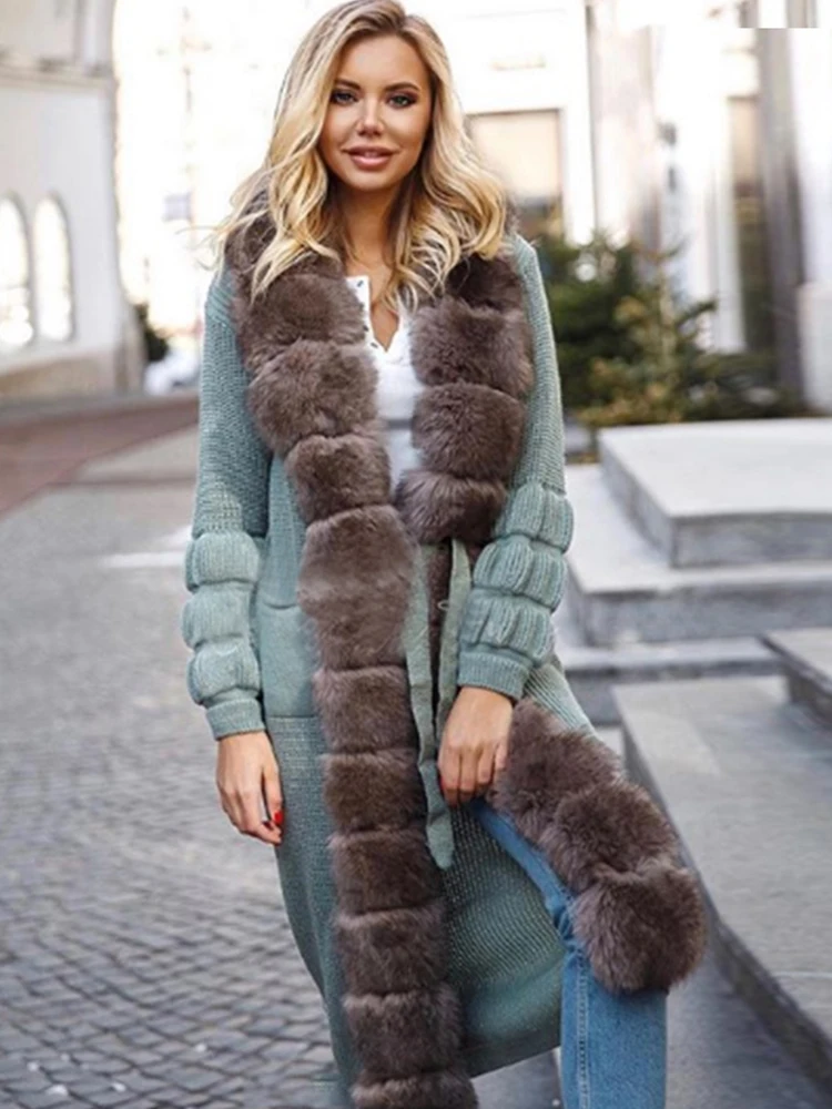 Женский длинный вязаный кардиган с поясом, теплая вязаная кофта с воротником из натурального Лисьего меха, большой размер, для зимы, 2021