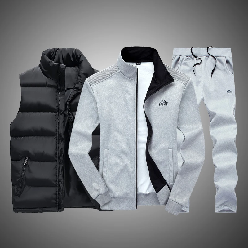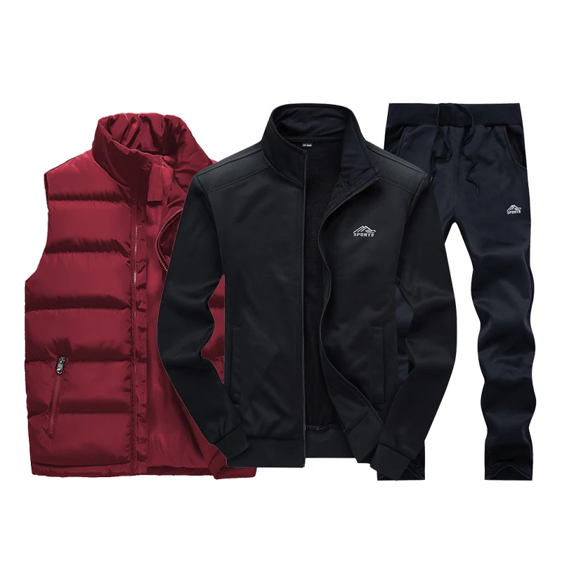 Новый Зимний утепленный спортивный костюм для мужчин из 3 предметов флисовая куртка + жилет на молнии + спортивные брюки мужской спортивный костюм с вышивкой пальто