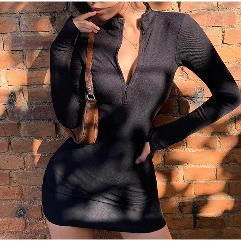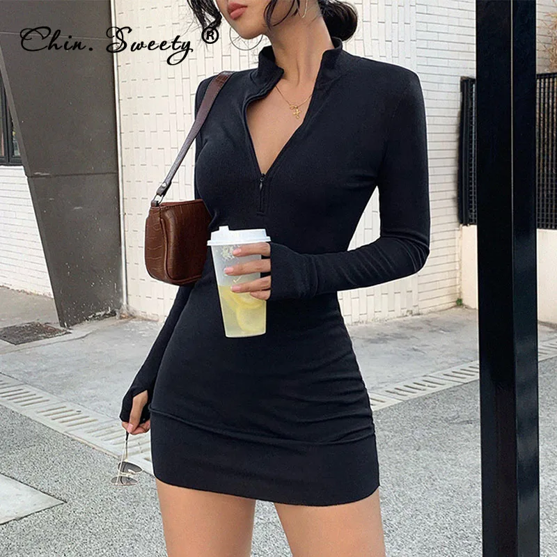 Однотонное женское облегающее платье-футляр с воротником-стойкой, осень 2021, обтягивающие мини-платья на молнии с длинным рукавом, женские сексуальные уличные платья