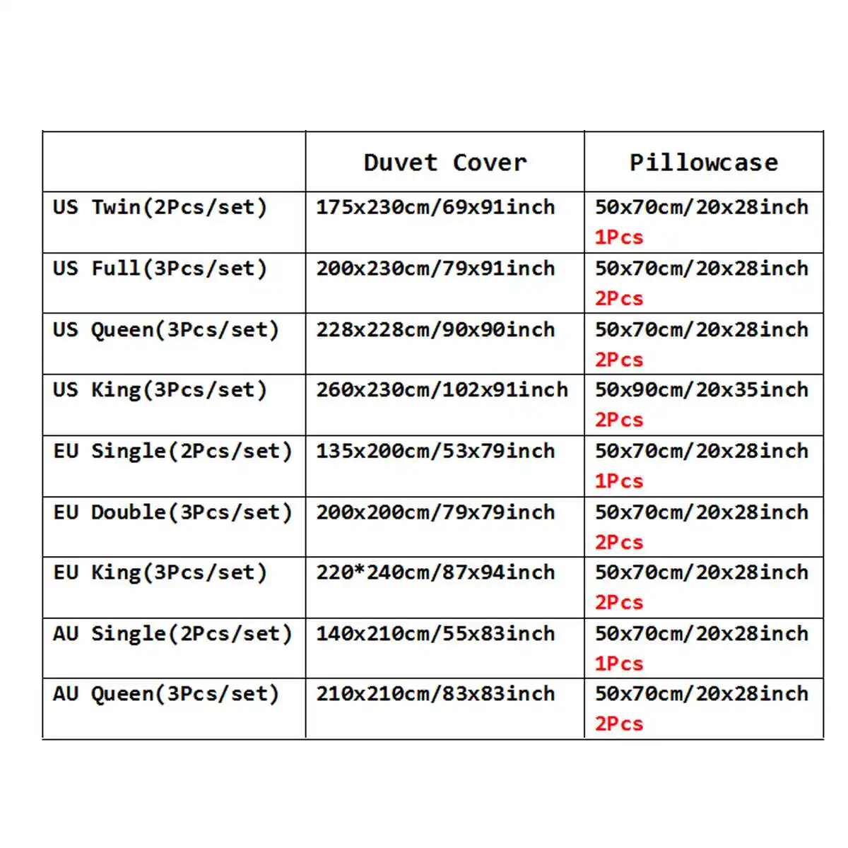 AU Single(2 шт./компл.):1 * пододеяльник 140х210см/55х83дюйма1 * наволочки 50x7 0 см/20x28дюйма