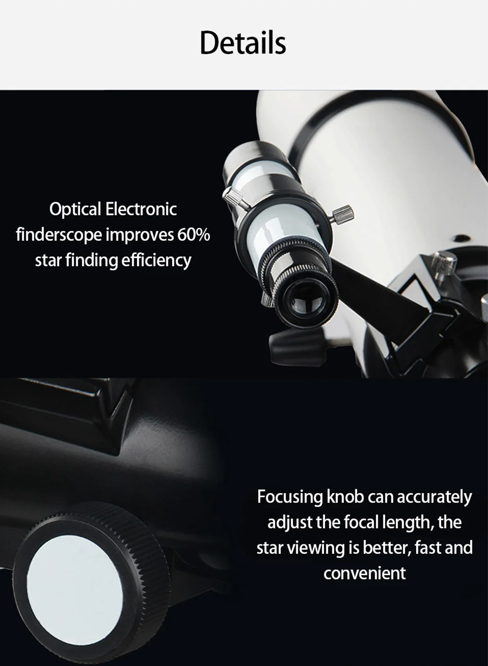 1. Высококачественный алюминиевый сплав: вам не придется беспокоиться о поломке2. Красивый внешний вид больше подходит, чтобы стимулировать интерес детей3. Один год гарантии4. У нас есть видео установки, легко установить5. Бесплатный мобильный телефон-держатель, так что вы можете использовать свой мобильный телефон для записи красоты звезд