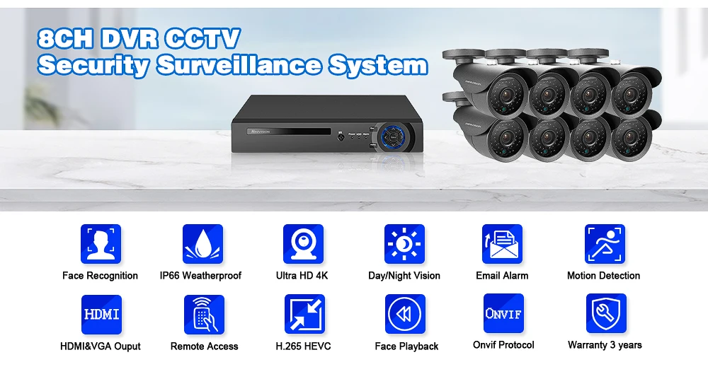 1, Ультра HD 4K дисплей высокой четкости, 6 в 1 гибридный цифровой видеорегистратор;2. Ультра HD 8MP AHD камера, металлический материал, IP66 водонепроницаемый, подходит для внутреннего и наружного использования; Пыленепроницаемый, надежный для домашней безопасности;4. Улучшенное H.265 Сжатие видео, подключи и работай, простая настройка;3. Поддержка распознавания лица, воспроизведения лица, обеспечивает ультра высокое разрешение видео наблюдения, обеспечивая максимальную детализацию и четкость доступны;4. Все камеры поддерживают расстояние передачи 500 метров, ночное видение до 30-40 м с умным ИК, четкое дневное и ночное видение с автоматическим ИК-излучением;6. Поддержка обнаружения движения, оповещения по электронной почте, воспроизведения видео и многоязычности;7. Поддержка Android,Iphone,Ipad,PC,VMS,P2P view;8. Удаленный доступ в любом месте, в любое время;