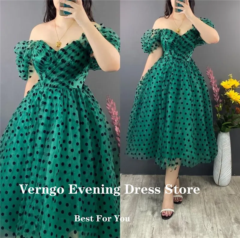 Черные тюлевые трапециевидные платья принцессы Verngo в горошек для выпускного вечера с открытыми плечами и коротким рукавом вечерние платья длиной ниже колена