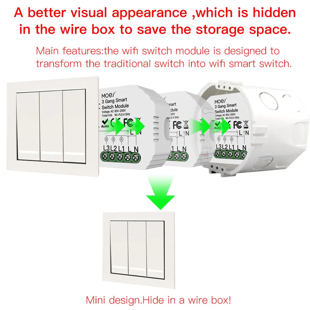 Мини DIY WiFi смарт-светильник с переключателем 3 банды 1/2 Way модуль Smart Life/Tuya приложение беспроводной пульт дистанционного управления, совместимый с AmazonAlexa и Google Home Изготовитель: MoesHouse Особенности продукта: