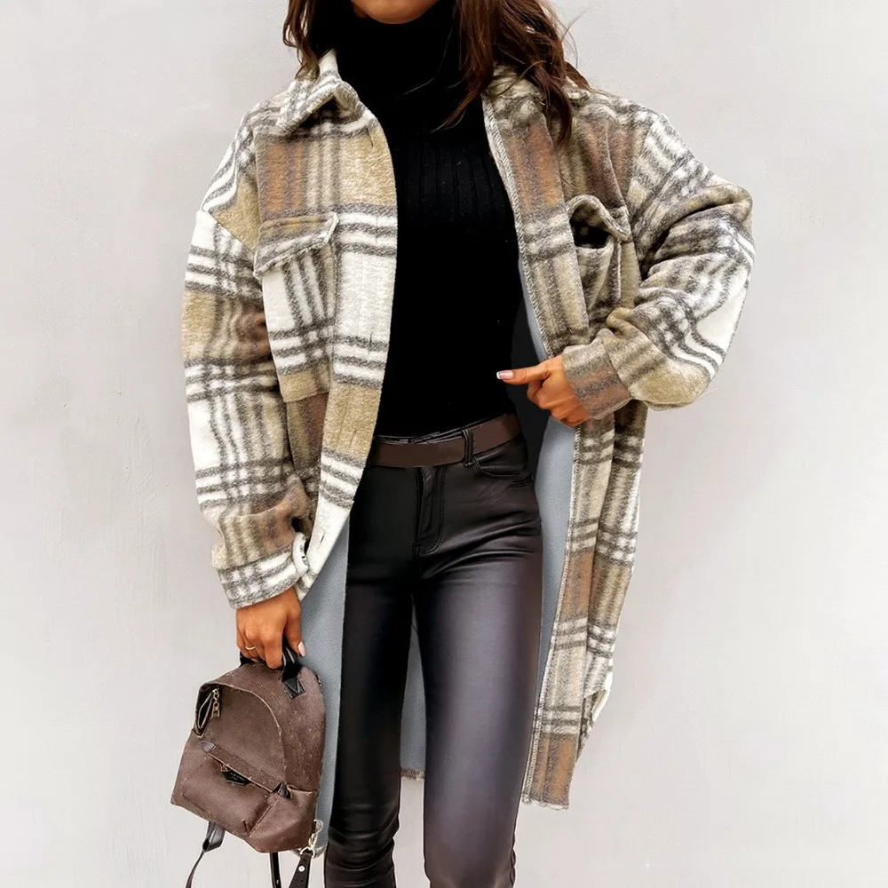 Женская клетчатая куртка в стиле оверсайз, тонкая длинная куртка с отложным воротником, в стиле ретро, зима 2021