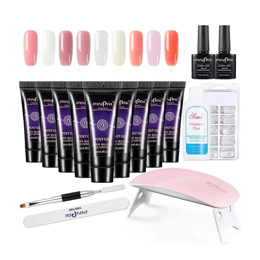 9 цветов, УФ-лак для наращивания ногтей, полигель, Профессиональный жесткий лак/клей/набор кистей с УФ-лампой, набор быстросохнущих наборов полигеля для ногтей