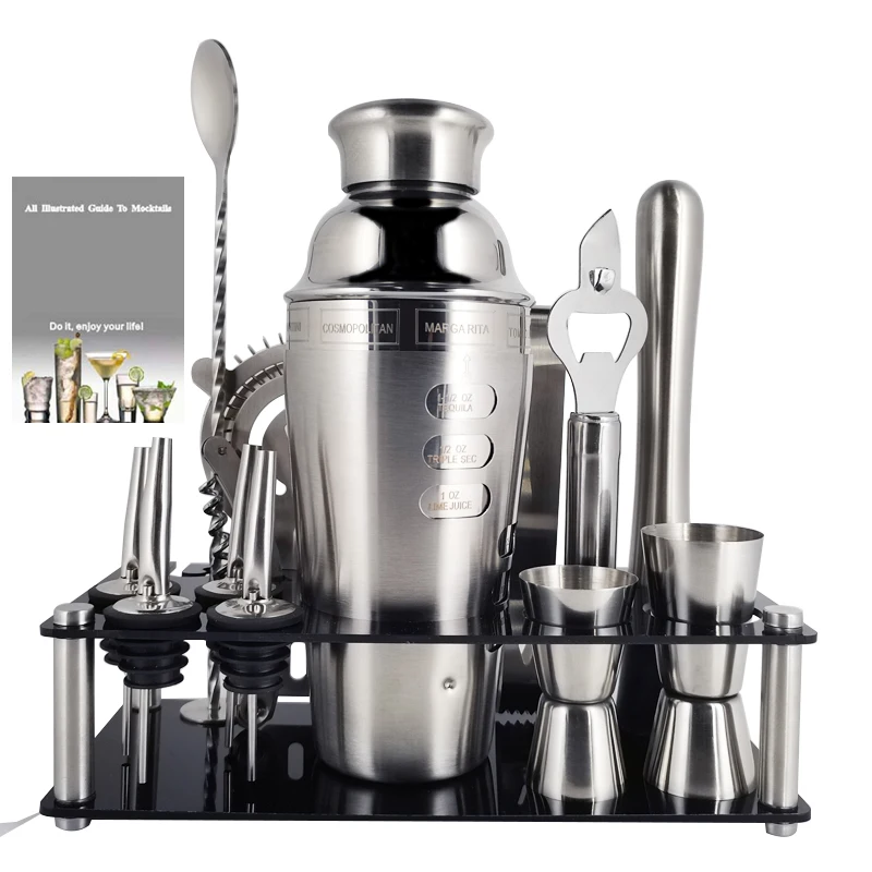 Шейкер-1 шт., смешатель-1 шт., сетчатый фильтр-1 шт., щипцы для льда-1 шт., ложка-1 шт., штопор-4 шт., штопор-1 шт., Джиггер-1 шт. на 15/30 мл, jigger-1 шт. 25/50 мл, консервный нож-1 шт., коктейльный рецепт-1 шт., акриловый стенд-1 шт.