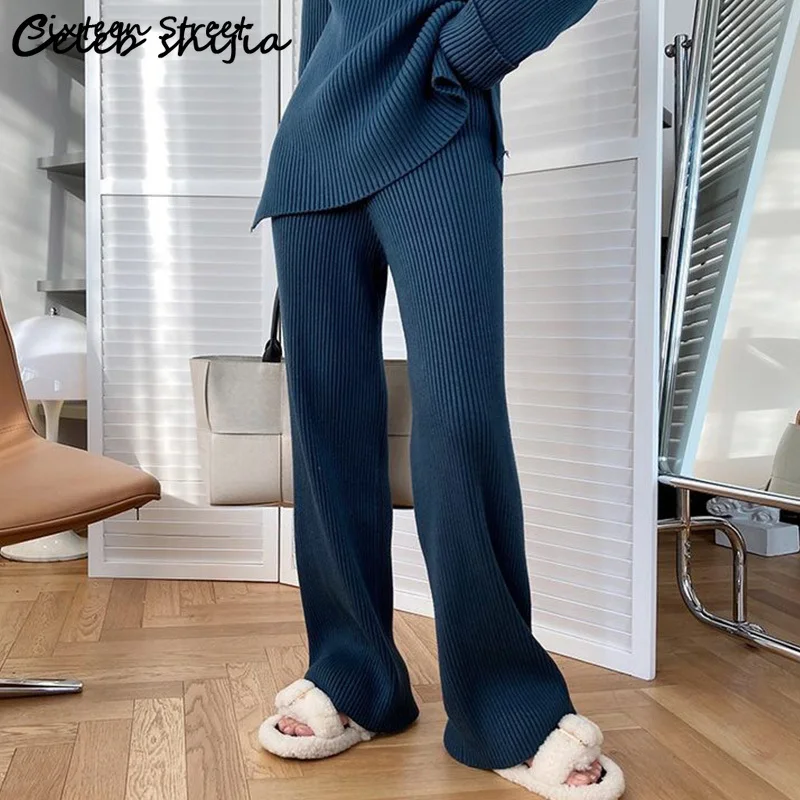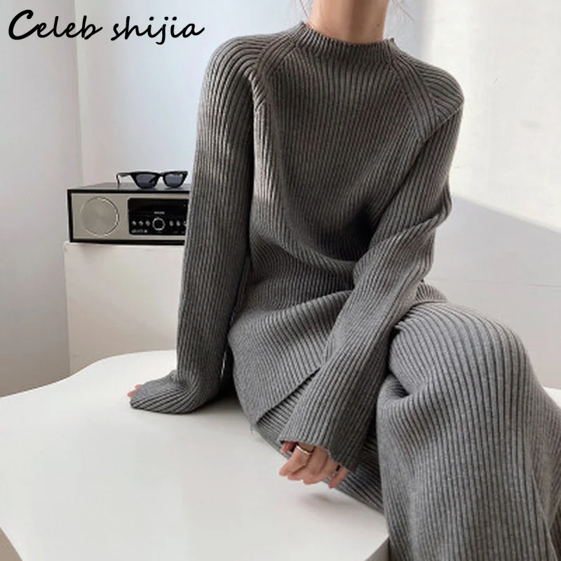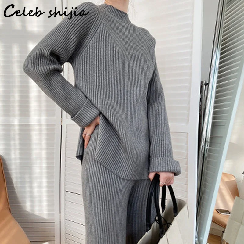 Мягкие зимние комплекты из шерстяных брюк, женский серый свитер с круглым вырезом и брюки с высокой талией, корейские свободные теплые вязаные комплекты из 2 предметов на осень и зиму