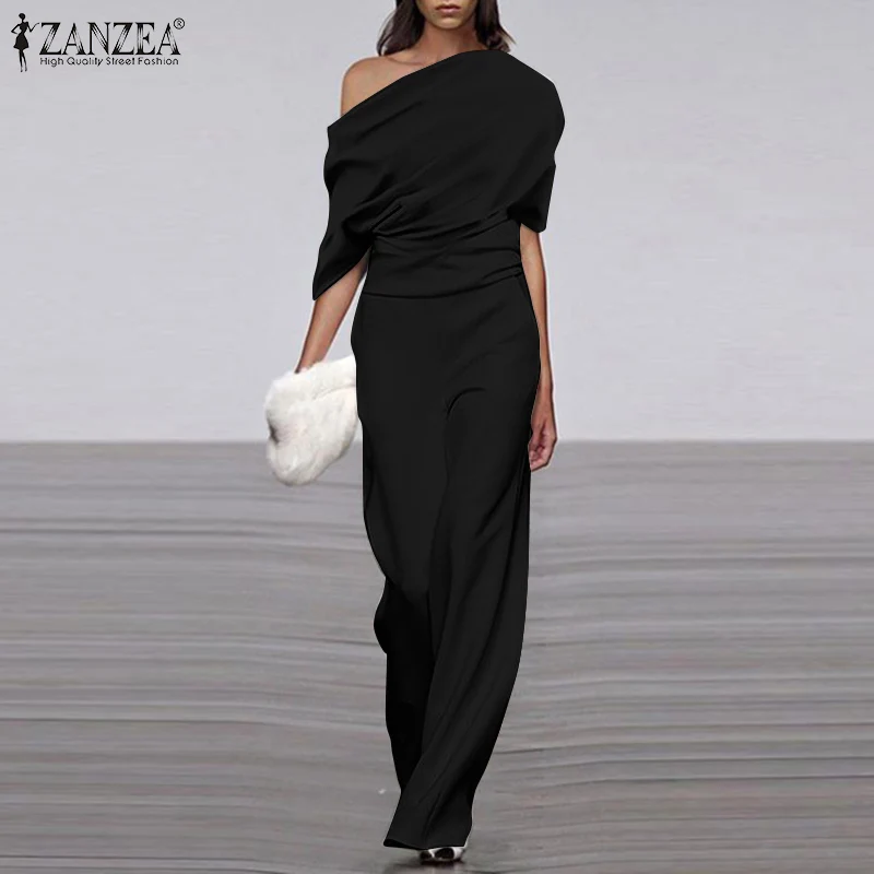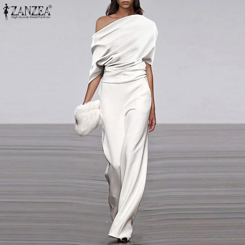 Комбинезон ZANZEA женский с открытыми плечами, элегантный повседневный однотонный длинный ромпер с коротким рукавом и широкими штанинами, OL, на лето