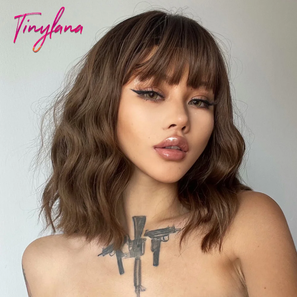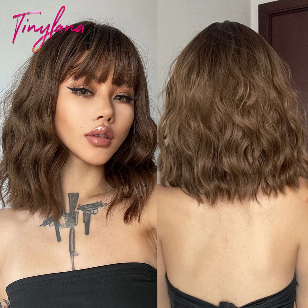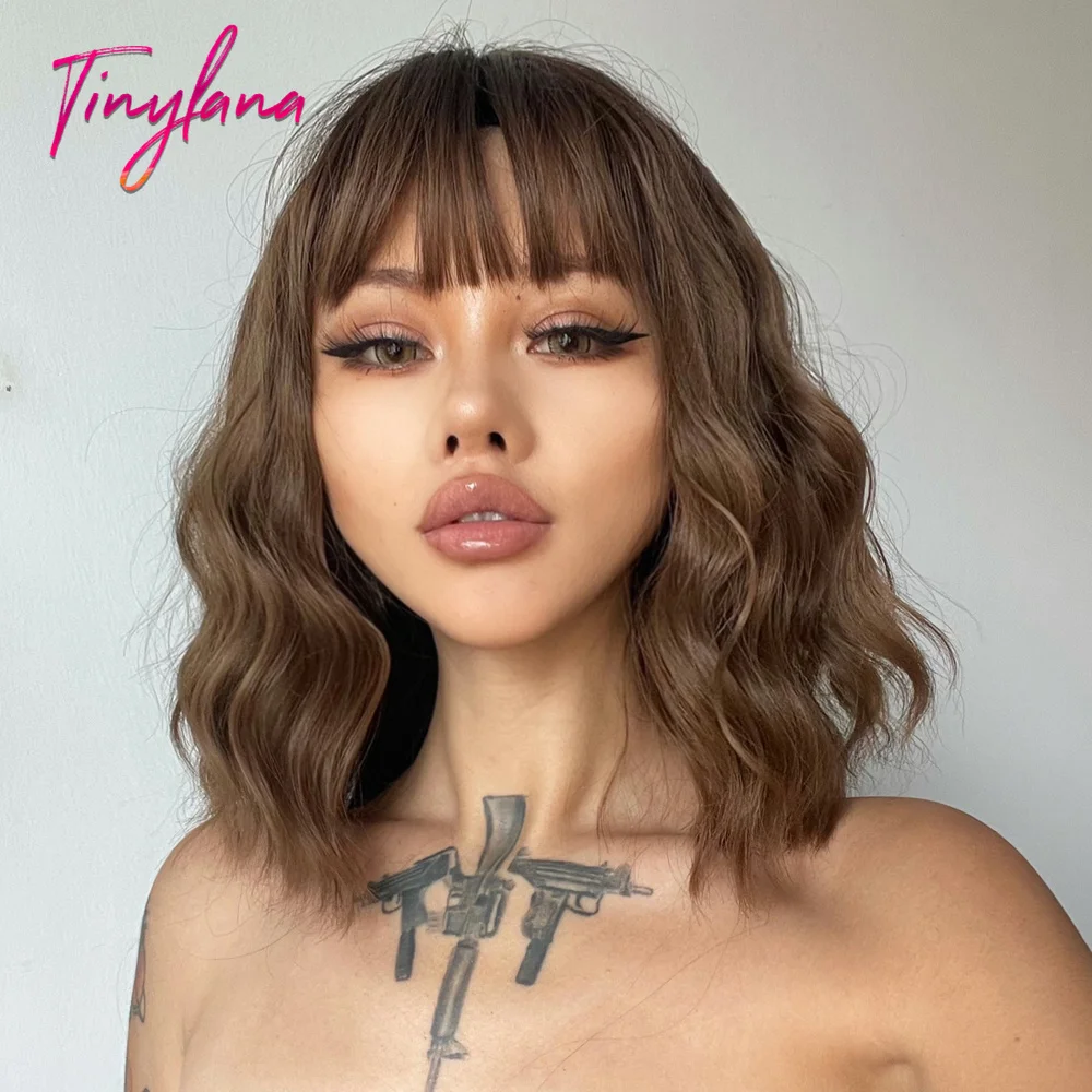 Короткий синтетический парик Боб, коричневые волнистые волосы Омбре, парики с челкой для чернокожих женщин, средний, для косплея, повседневные, натуральные волосы, термостойкие