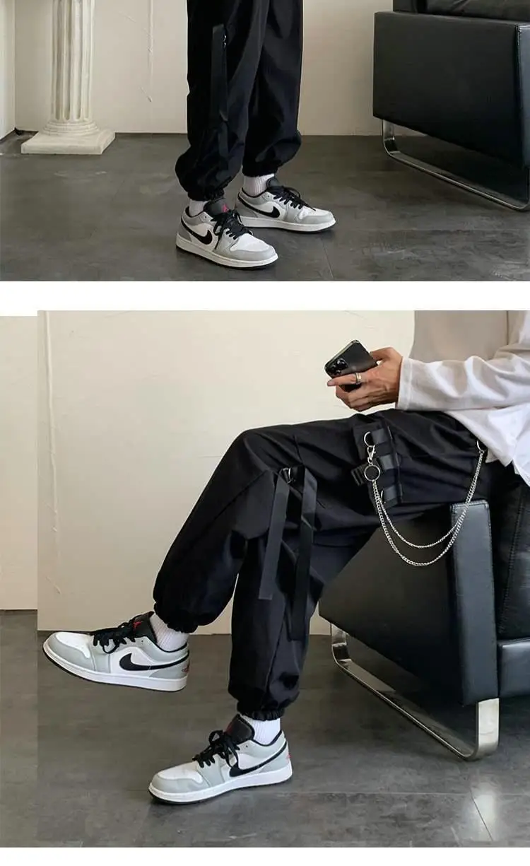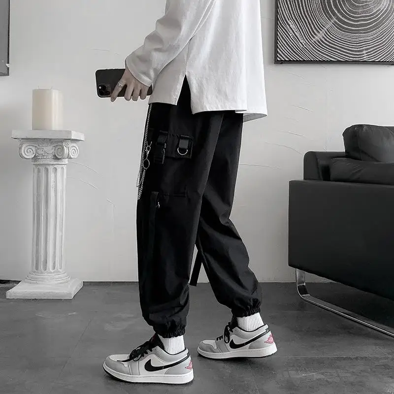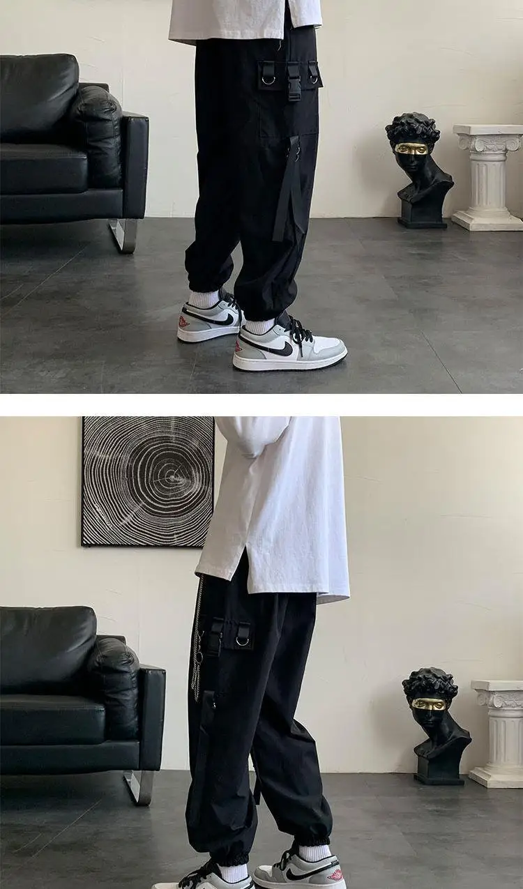 Брюки-карго мужские в стиле хип-хоп, модные штаны с лентами в стиле Харадзюку, Повседневная Уличная одежда с эластичным поясом, джоггеры черные, 2022