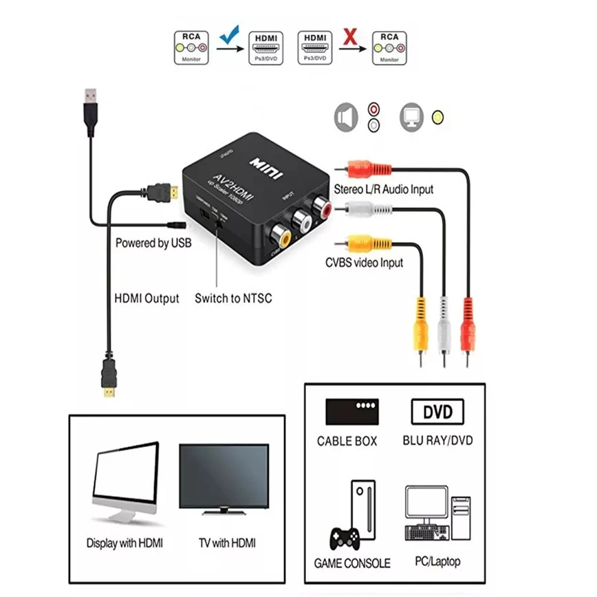 Этот мини AV/CVBS к HDMI-совместимый конвертер является универсальным преобразователем для аналогового композитного входа в HDMI-совместимый 1080p (60 Гц) выход