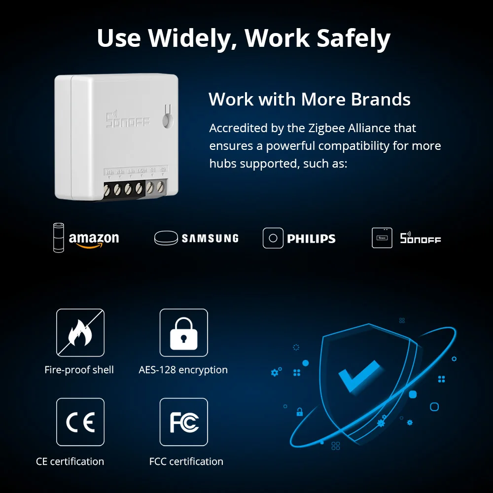 Оболочка является огнестойкой и огнезащитной оболочкой, которая улучшает пожарную безопасность, когда ZBMINI работает с вашими устройствами. Сертификация CE и FCC. Протокол ZigBee 3,0 с AES-128 шифрованием обеспечивает безопасность и нечитаемость данных вашего устройства с помощью посторонних глаз.