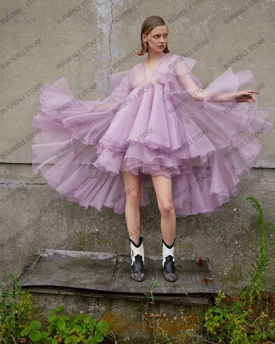 Милые светильник-фиолетовые короткие летние женские платья с рюшами и V-образным вырезом