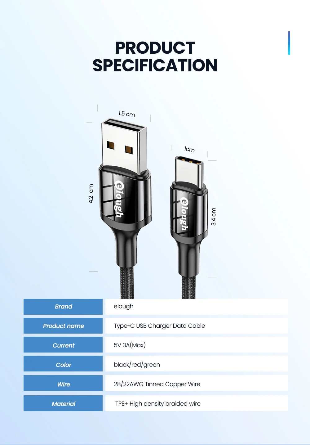 Кабель зарядный Elough USB Type-C, 3 а, с поддержкой быстрой зарядки
