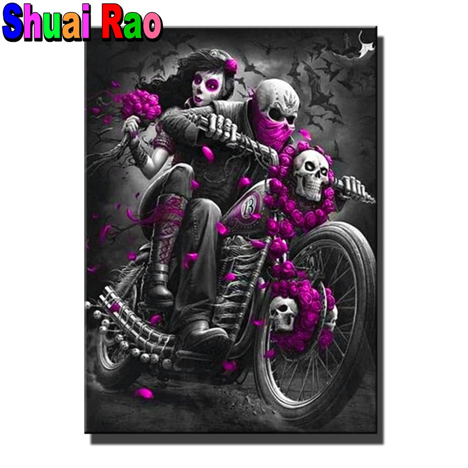 Full Square Diamond Painting Dark Motorcycle Skull Couple 5d Embroidery Gothic Love Handmade Home Decor Cross Stitch Halloweenaf