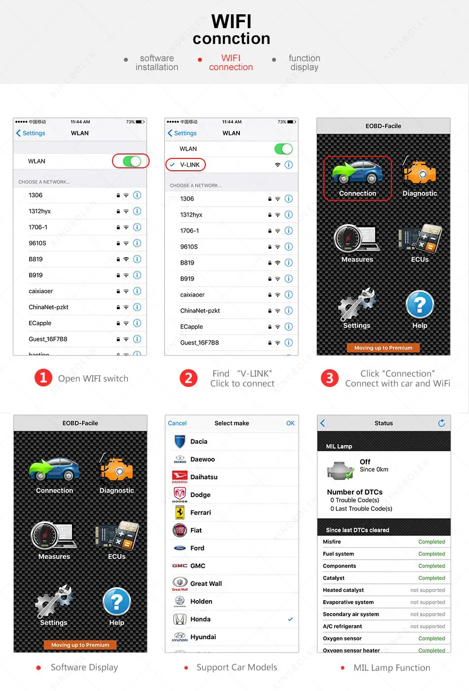 1. Открытый переключатель WIFI2. Найдите «V-LINK», нажмите для подключения3. Откройте приложение, нажмите «Подключение», Подключите автомобиль к WIFI