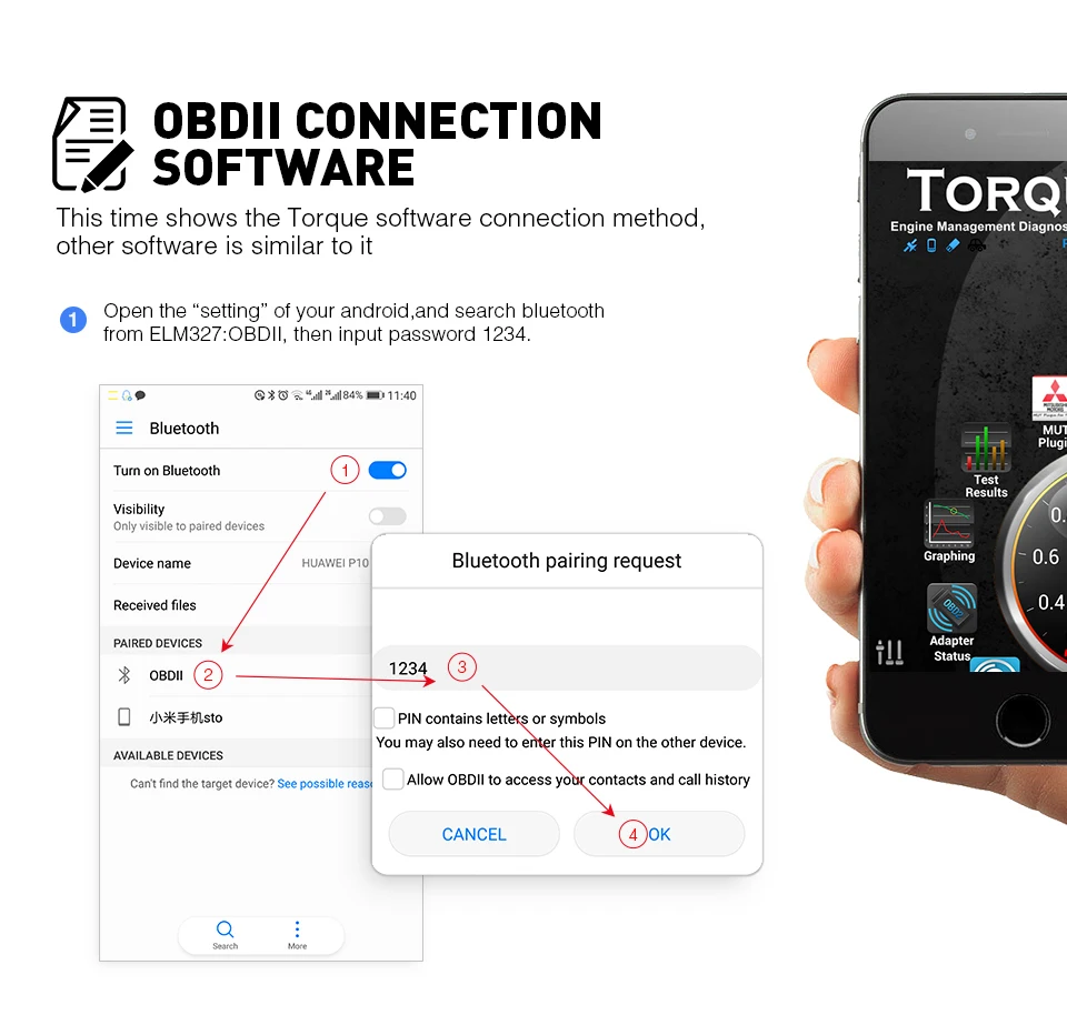 О: на телефоне android:1. Откройте «Настройки» вашего android и найдите BT из ELM327:OBDll, затем введите пароль 1234.2. Откройте крутящий момент -- etting --- адаптер OBD2 Settins --- Тип подключения --- BT --- back --- ChooseBT устройство --- OBDII[AA:BB:CC:11:22:33].