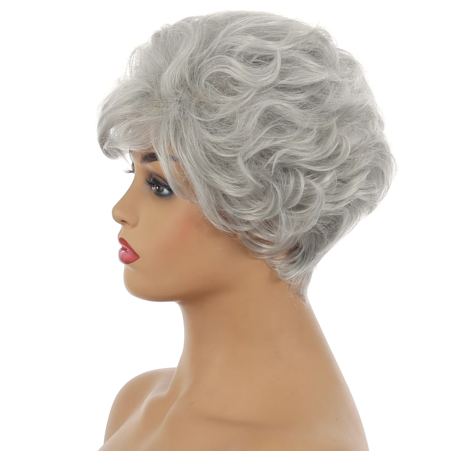 Короткие вьющиеся синтетические парики для женщин, парики с челкой, натуральные серебристо-серые термостойкие волосы для ежедневного использования