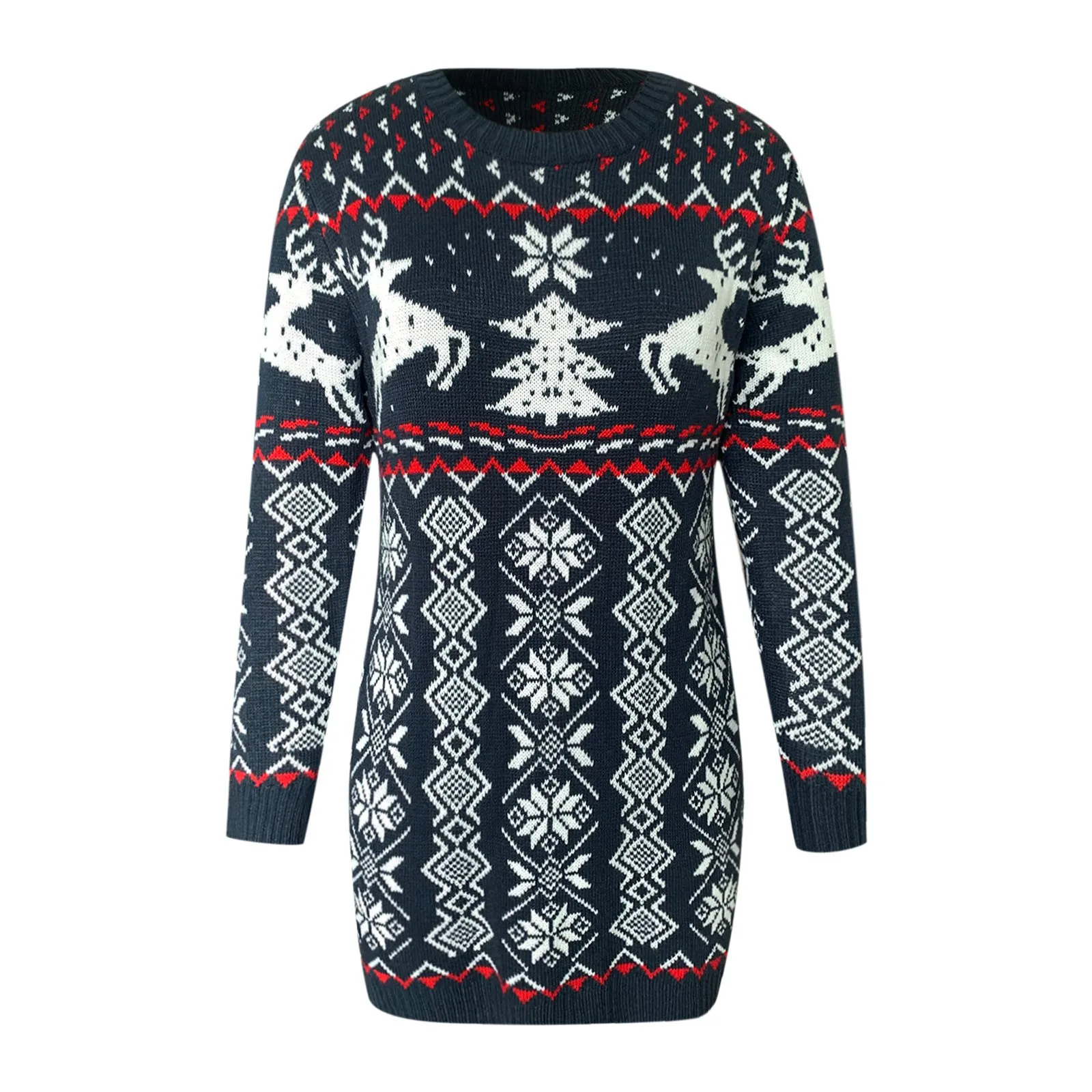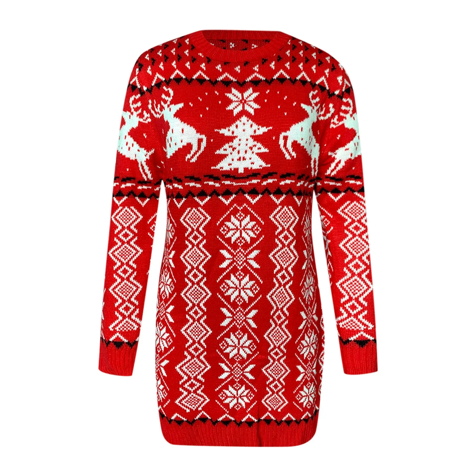 Женский Рождественский пуловер с круглым вырезом и изображением оленя снежинки, трикотажное мини-платье
